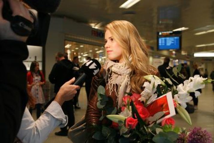 Evróvisjón-fararnir lentu um þrjú leitið. Þegar flugvélin var lent ók slökkviliðið að vélinni og sprautaði vatni yfir hana þeim til heiðurs. Það var einnig gert þegar landsliðið í handbolta vann silfurverðlaun á Ólympíuleikunum í Peking á síðasta ári. Jóhanna Guðrún í viðtali. Þarna hefur hún ekki sofið í um sólarhring.Mynd/Hilmar Bragi vf.is Þegar inn í flugstöðina var komið tóku Páll Magnússon útvarpsstjóri, Þórhallur Gunnarsson dagskrástjóri og Katrín Jakobsdóttir menntamálaráðherra á móti ferðalöngunum sem hafa ekkert hvílst síðan í gær. Katrín færði þeim blóm og las svo upp kveðju frá Jóhönnu Sigurðardóttur, forsætisráðherra. Jóhanna þreytt en sæl ásamt föruneyti. Mynd/Hilmar Bragi, vf.is. Gríðarleg hamingja einkenndi sigurvegarana. Jóhanna Guðrún og Óskar Páll Sveinsson, lagahöfundur, ljóstruðu upp að þeim hefði verið boðin atvinnutækifæri sem þeim leist vel á. Athöfnin var stutt og laggóð. Nú er haldið niður í Ráðhús þar sem Borgarstjóri mun halda móttöku fyrir þau. Svo verður haldin sigurhátíð á Austurvelli klukkan 17:30.