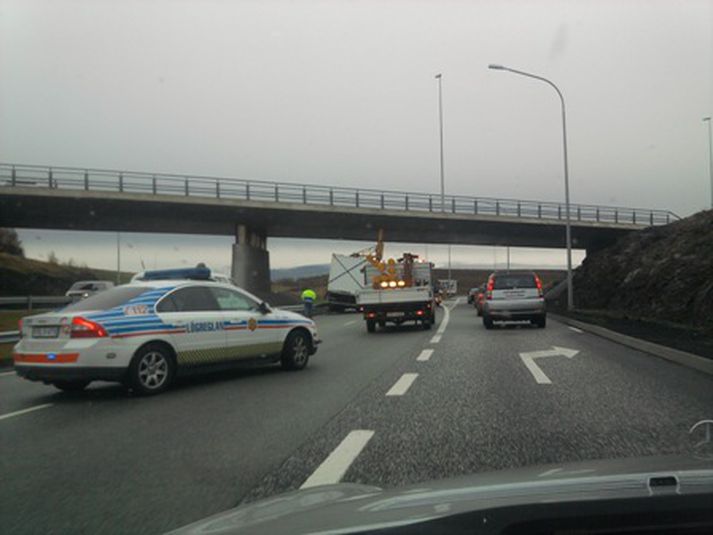 Ökumaður flutningabíls uggði ekki að sér þegar hann ók undir brú á Reykjanesbraut í morgun. Bóma á krana bílsins var of hátt uppi og rakst hún því upp undir brúargólfið eins og sést á myndinni. Nokkur röskun varð á umferð vegna þessa en að sögn lögreglu slasaðist ökumaðurinn ekki við áreksturinn.