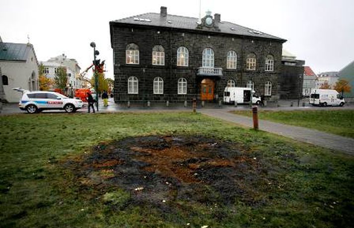 Hreinsunarstarfsmenn eru langt komnir með að hreinsa Alþingishúsið og Austurvöll en þeir hafa verið að í níu klukkustundir. Einn þeirra sagði í samtali við ljósmyndara Fréttablaðsins að hann hefði aldrei séð annað eins. Eins og þegar hefur komið fram söfnuðust þúsundir manna saman á Austurvelli í gær þegar að forsætisráðherra flutti stefnuræðu sína og umræður um hana fóru fram. Yfir 30 rúður voru brotnar og dýrablóði var skvett á þinghúsið.Mynd/ PjeturMynd/ PjeturMynd/ PjeturMynd/ PjeturMynd/ PjeturMynd/ Pjetur.