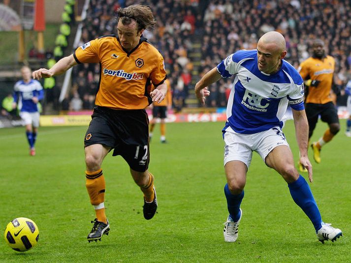 Bolton vann 2-1 sigur á Blackburn í ensku úrvalsdeildini þrátt fyrir að lenda manni undir í stöðunni 0-0 þegar 34 mínútur voru eftir af leiknum. Wolves bætti á sama tíma stöðu sína á botninum með því að vinna 1-0 sigur á Birmingham. Stuart Holden tryggði Bolton 2-1 sigur á Blakcburn með því að skora sigurmarkið á 88. mínútu. Boltin komst upp í 5. sæti deildarinnar með sigrinum en Tottenham getur endurheimt fimmta sætið þegar liðið mætir Chelsea klukkan 16.00. Bolton var miklu sterkara liðið framan af leik en Blackburn endaði fyrri hálfleikinn betur. Staðan var markalaus í hálfleik en í seinni hálfleiknum fóru hlutirnir að gerast. Bolton-maðurinn Mark Davies fékk sitt annað gula spjald á 56. mínútu fyrir að fara með olbogann hátt á lofti inn í skallaeinvígi við Phil Jones. Bolton lagði þó ekki árar í bát og varamaðurinn Fabrice Muamba kom Bolton í 1-0 á 65. mínútu með laglegu skoti úr teignum eftir að mikið hafði gengið á í kjölfarið af aukaspyrnu Sam Rickett. Mame Biram Diouf jafnaði leikinn á 87. mínútu eftir stungusendingu frá Jason Roberts en Stuart Holden kom Bolton yfir aftur í næstu sókn. Sam Rickett átti þá langa sendingu sem Kevin Davies skallaði fyrir fætur Holden. Það reyndist síðan vera sigurmark Bolton. Grétar Rafn Steinsson sat allan tímann á bekknum en Sam Rickett átti mjög góðan leik í hægri bakverðinum og heldur áfram stöðu sinni. Rickett átti meðal annars þátt í báðum mörkum Bolton. Stephen Hunt tryggði Úlfunum þrjú stig í dag.Mynd/APStephen Hunt skoraði eina markið í 1-0 sigri Wolves á Birmingham en þetta var annar heimasigur Úlfanna í röð. Sigurinn dugði þó ekki Wolves til að sleppa úr fallsæti en liðið er í næstsíðasta sæti stigi á eftir Fulham og Wigan. Sigurmark Hunt kom eftir sendingu frá Sylvan Ebanks-Blake á lokamínútu fyrri hálfleiks. Wolves hafði unnið 3-2 sigur á Sunderland í síðasta heimaleik liðsins á undan þessum.