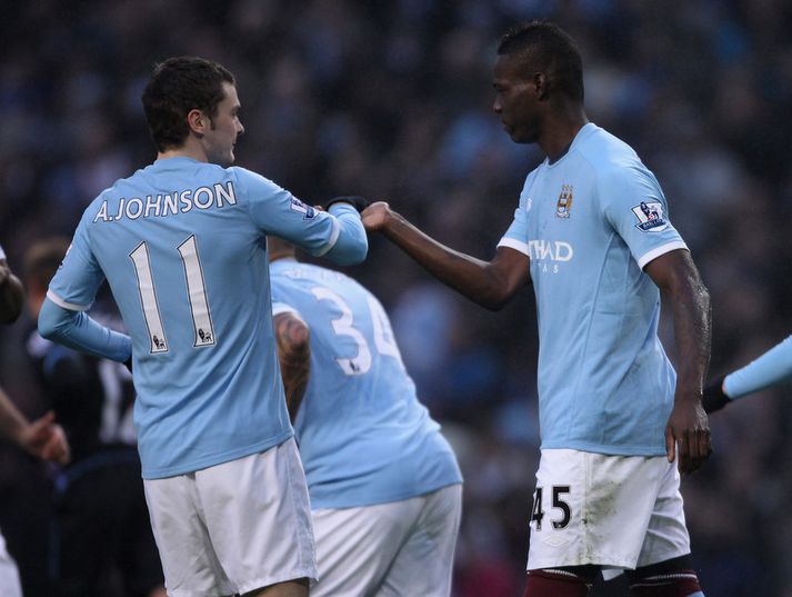 Mario Balotelli skoraði þrennu fyrir Manchester City í 4-0 stórsigri á Aston Villa í gær en fyrr um daginn voru fjölmiðlar uppteknir af því að strákurinn væri að deyja úr heimþrá. Balotelli hefur skorað 8 mörk í 11 leikjum fyrir City en hann er ekki mikið að fagna þessum mörkum sínum sem mörgum þykir undarlegt. „Ég er alltaf áægður og líka þótt ég brosi ekki," sagði Mario Balotelli í viðtali á heimasíðu Manchester City þar sem hann var spurður út í það af hverju hann fagni ekki meira mörkum sínum. „Framherji á að skora mörk. Það er vinnan mín og þess vegna brosi ég ekki. Ég er samt ánægður og ég get líka skorað fleiri mörk," sagði Balotelli. Mario Balotelli fagnar með Adam Johnson.Mynd/Nordic Photos/Getty Carlos Tevez var hvíldur í leiknum á móti Aston Villa en nú bíða menn spenntir eftir því hvað Roberto Mancini gerir í næsta leik sem verður á móti Blackpool á laugardaginn. „Ég er mjög ánægður hjá Manchester City þótt að ítölsku blaðamennirnir séu að skrifa um það að ég vilji fara til AC Milan. Ég er hér og legg hart að mér á æfingum. Ég vil verða mikilvægur maður fyrir þetta félag og úrslitin ráðast nú alltaf inn á vellinum," sagði Balotelli. „Við getum orðið enskir meistarar og ég er vissu um að við verðum enn sterkari á nýju ári," sagði Balotelli að lokum.