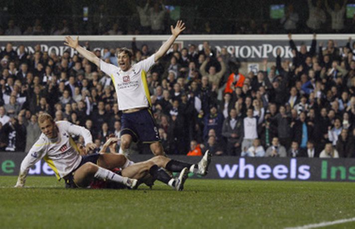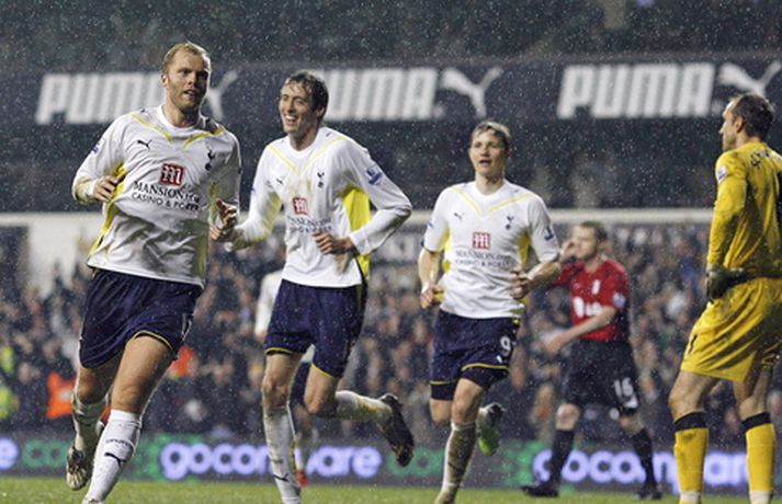 Eiður skoraði og hjálpaði Tottenham að komast á Wembley - myndir Óskar Ófeigur Jónsson skrifar 24. mars 2010 23:15 Eiður Smári fagnar marki sínu ásamt Luka Modric sem átti sendinguna á hann. Mynd/AFP Eiður Smári er miklu stuði þessa daganna eftir að hafa nýtt tækifærið sitt á móti Stoke um síðustu helgi. Eiður Smári skoraði í öðrum leiknum í röð í kvöld þegar hann innsiglaði 3-1 sigur Tottenham á Fulham í ensku bikarkeppninni. Eiður Smári hefur komist í sviðsljósið með frammistöðu sinni í síðustu tveimur leikjum enda hefur hann staðið sig mjög vel og verið miðpunktur í spili liðsins í þessum sigrum á Stoke og Fulham. Ljósmyndari AFP-myndaþjónustunnar náði nokkrum góðum myndum af Eiði Smára og markinu hans á White Hart Lane í kvöld. Myndirnar má sjá í albúminu hér að neðan. Hægt er að sjá myndirnar stærri með því að smella á þær.Mynd/AFPMynd/AFPMynd/AFPMynd/AFPMynd/AFPMynd/Getty ImagesMynd/AFP Mest lesið Joshua kjálkabraut Paul Sport Salah bað samherjana afsökunar Enski boltinn Gagnrýndi Paul: „Beið eftir að verða sleginn“ Sport Lineker fokillur við blaðamann: „Þvílíkt kjaftæði“ Enski boltinn Rekinn af HM eftir að hafa fallið á lyfjaprófi Sport Skírði soninn LFC og Mac Allister lét draum feðganna rætast Enski boltinn „Hann er ein stærsta ástæðan fyrir því“ Handbolti Varði fjórar vítaspyrnur með brotna hendi Fótbolti Dagskráin í dag: Enski boltinn í tíu klukkutíma Sport Jóga og pílates lykillinn að snöggri endurkomu Enski boltinn Fleiri fréttir Ekkert fararsnið á Guardiola sem segir að City verði að vera undirbúið Newcastle - Chelsea | Skjórar í meiðslakrísu gegn gestum á góðu skriði Tíu bestu mörkin úr leikjum Liverpool og Tottenham Salah bað samherjana afsökunar Lineker fokillur við blaðamann: „Þvílíkt kjaftæði“ Skírði soninn LFC og Mac Allister lét draum feðganna rætast Jóga og pílates lykillinn að snöggri endurkomu Fantasýn: „Hann setti allt á 3 og það kom upp 19“ Alexander Isak fékk sænska gullboltann „Salah líkaði ekki að vera í skugganum af Isak og Wirtz“ Amorim vill Neves Benti á hinn íslenska Dan Burn Lést á leiðinni heim úr fótboltaleik Forsætisráðherrann hótar Roman Abramovich og segir að „klukkan tifi“ „Sýnum kvennaíþróttir af því að þær eru frábærar“ Snéri aftur í fótbolta eftir 35 ára hlé: „Kalla mig Jackie Grealish“ Óttast að besti leikmaður Liverpool verði frá Ungstirnið skallaði meistarana áfram Gat ekki komið í veg fyrir að City færi áfram City sagt ætla að keppa við Liverpool og United um Semenyo Man United ósátt við Marokkó og FIFA Sápan trolluð: „Þetta er þessi klikkhaus með röddina“ Stjarnan fór í dulargervi: Setti stuðningsmann United á óþekka listann Garnacho skaut Chelsea áfram í undanúrslit Vísa á bug fullyrðingum Bruno sem hafa valdið fjaðrafoki Hlaut 21 árs dóm fyrir að aka inn í skrúðgönguna í Liverpool Bjarni segir Newcastle stærra félag en Tottenham Moyes ældi alla leiðina til Eyja Bróðirinn sendir Amorim skilaboð: „Frelsið Kobbie Mainoo“ „Besta frammistaða United undir stjórn Amorim“ Sjá meira
