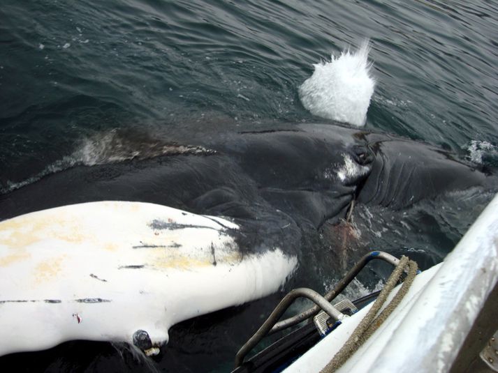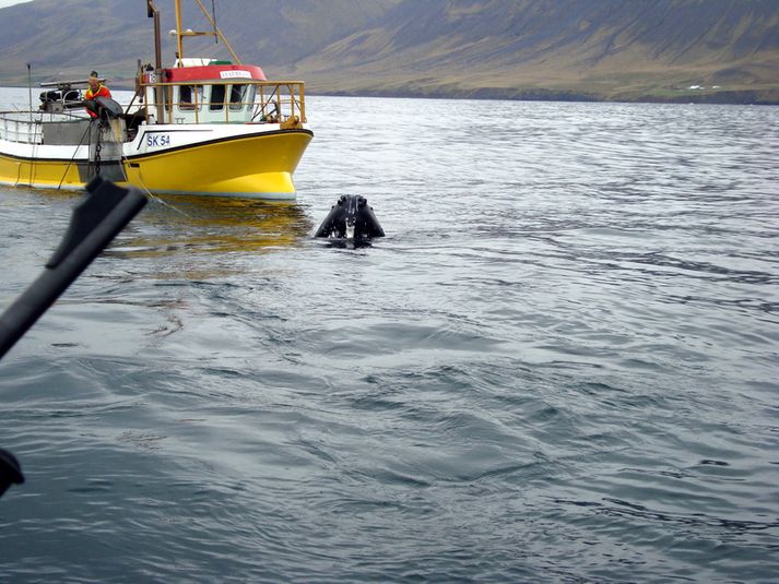 Hnúfubakur festist í þorskaneti 22. september 2010 11:44 Myndir: Jurijs Stór hnúfubakur flæktist í veiðarfærum netaveiðibátsins Hafborgarinnar í Skagafirði í gær. Ómögulegt var að losa hnúfubakinn þar til búið var að aflífa hann. Fréttavefurinn Feykir greinir frá þessu. Hafborgin, sem er tæplega 10 tonna bátur, var að vitja þorskneta þegar Sævar Steingrímsson skipstjóri varð var við hnúfubakinn. Hvalurinn hafði flækst í netunum þannig að þau voru föst uppi í kjaftinum á honum. Ekki tókst Sævari að losa skepnuna og hringdi í land eftir aðstoð. Mat manna var að eina leiðin til að losa skepnuna án þess að tjón yrði á veiðarfærum væri að aflífa hana. Eftir að hvalurinn var aflífaður var hann dreginn losaður og sökk hann þá í hafið. Sævar segir í samtali við Feyki að hann hafi ekki talið að nein hætta væri á ferðum þó skepnan hafi verið stærri en báturinn því hún var mjög máttfarin. Hvorki varð tjón á bát né veiðarfærum. Vefur Feykis. Mest lesið Lögregla fékk send myndbönd af árásinni frá vegfarendum Innlent Óvæntur stórsigur í Texas hringir bjöllum hjá Repúblikönum Erlent Vilja kengbeygja kvenfélagið og krefjast Ketiláss alls Innlent Hljóp upp í fjall eftir árekstur og neitaði að koma niður Erlent Trump lokar Kennedy-miðstöðinni í tvö ár „vegna endurbóta“ Erlent „Ég spyr hvernig hefði farið ef ég hefði ekki lifað þetta af“ Innlent Kári Stefánsson fordæmir vinnubrögð Moggans Innlent Skýr skilaboð um að það borgi sig ekki að leita til Íslands Innlent Töframaður lúbarinn í Garðabæ: „Ég hélt að þetta væri búið“ Innlent „Njósnasjeik“ keypti Trump-félag og fékk flögur Erlent Fleiri fréttir Vilja ekki óundirbúnar fyrirspurnir í borgarstjórn Kári Stefánsson fordæmir vinnubrögð Moggans Vilja kengbeygja kvenfélagið og krefjast Ketiláss alls Skýr skilaboð um að það borgi sig ekki að leita til Íslands Lögregla fékk send myndbönd af árásinni frá vegfarendum Boðar aðgerðir gegn brotastarfsemi Samstillt þingnefnd vill taka ESB út úr orðalagi nýrrar stefnu Um 125 börn á þyngdarstjórnunarlyfjum og 500 með fitulifur Gagnagrunnur heimilisfanga ICE-liða hýstur á Íslandi Dyravörður tók gest kverkataki Geta stórbætt þjónustu fyrir þau sem greinast með krabbamein Segir af sér þingmennsku að ákveðnu skilyrði uppfylltu Sáttamiðlun úrræði sem væri alls ekki fyrir alla þolendur Spennt að mæta fyrrverandi yfirmanni í kappræðum Líkurnar á lækkun „mjög litlar“ Mótmæla og biðla til utanríkisráðherra Nýir oddvitar og sáttameðferð í kynferðisbrotamálum Töframaður lúbarinn í Garðabæ: „Ég hélt að þetta væri búið“ „Ég spyr hvernig hefði farið ef ég hefði ekki lifað þetta af“ Sprengisandur: Laxeldi, verðbólga og falsfréttir Grunaður um stórfellda líkamsárás „Á yfir höfði sér kærur vegna fjölda umferðarlagabrota“ Ölvuð kona grunuð um að valda umferðarslysi á rafhlaupahjóli Hlýnandi veður í dag og „meinlaus austanlægð“ í kortunum Hilmar Gunnarsson er oddviti í Mosfellsbæ Vilhjálmur Árnason leiðir Sjálfstæðismenn í Reykjanesbæ Baráttan hafi verið Viðreisn til sóma „Lúxusvandamál“ að velja og hafna á listann Stöðvuðu stolinn bíl með naglamottu eftir eftirför um alla borg Sjálfstæðismenn í Reykjanesbæ velja sér oddvita Sjá meira