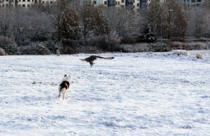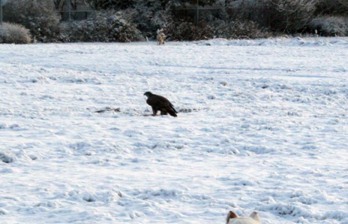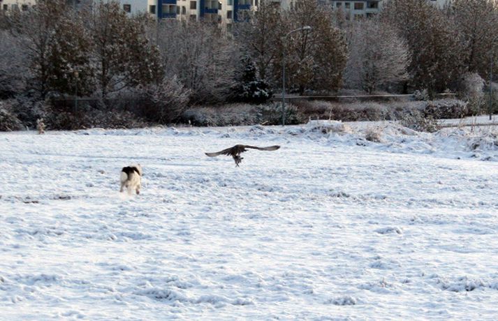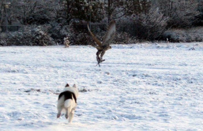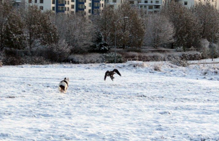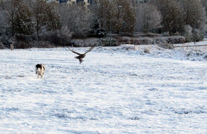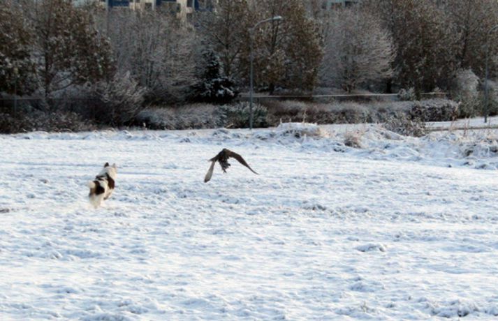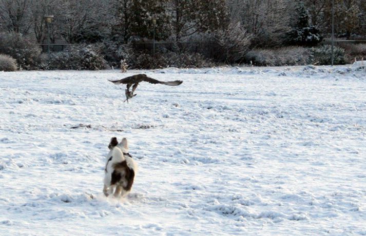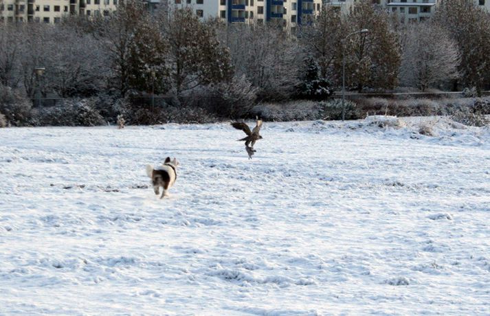 Tíkin Flækja hitti fálka í Laugardalnum Erla Hlynsdóttir skrifar 5. nóvember 2010 15:23 Flækju fannst fálkinn spennandi leikfélagi. Tíkin Flækja er aðeins sex mánaða gömul og fer daglega í göngutúr um Laugardalinn með eiganda sínum, Ásrúnu E. Magnúsdóttur. Þar hitta þær gjarnan hrafna og jafnvel gæsir en í gærmorgun blasti við þeim ný sjón þegar þær rákust á tignarlegan fálka með blóðuga bráð í klónum. „Krummunum finnst ógurlega gaman að stríða henni. Þeir lenda á jörðinni, hún hleypur og þegar hún nálgast fljúga þeir aftur af stað," segir Ásrún. Hún tók myndavél með í göngutúrinn í gær til að ná myndum af tíkinni litlu í fyrsta snjó vetrarins. Þegar þær komu auga á fugl ákvað Ásrún að sleppa Flækju lausri til að hún gæti leikið sér. „Ég hélt fyrst að þetta væri krummi en þegar hún hljóp af stað sá ég þetta gríðarlega vænghaf og sá að þetta var fálki sem flaug af stað með morgunmatinn sinn," segir Ásrún. Nokkuð af fiðri og blóði var í snjónum eftir átök fálkans við bráðina en Ásrún var ekki viss um hvers konar fugl hann hafði veitt. Hún er ættuð úr sveit og hefur áður séð fálka utan þéttbýlis en aldrei inni í borginni. Þar sem þær voru á göngu í nágrenni Fjölskyldu- og húsdýragarðsins í Laugardalnum hafði blaðamaður samband við starfsfólk þar sem kannaðist ekki við að nokkur fálki eða hænsn hafi sloppið út. Hins vegar sagði gamalreyndur starfsmaður að á veturna flygi fálki daglega yfir garðinn og helstu veiðilendur í Laugardalnum. Vel má því vera að þarna hafi verið sami fálki á ferð sem sannarlega hafði erindi sem erfiði þennan daginn.MYND/Ásrún E. MagnúsdóttirMYND/Ásrún E. MagnúsdóttirMYND/Ásrún E. MagnúsdóttirMYND/Ásrún E. MagnúsdóttirMYND/Ásrún E. MagnúsdóttirMYND/Ásrún E. MagnúsdóttirMYND/Ásrún E. MagnúsdóttirMYND/Ásrún E. MagnúsdóttirMYND/Ásrún E. Magnúsdóttir Mest lesið Njósnastjóri Trumps leitar að kosningasvindli Erlent „Muni ekki valda neinu öðru en umferðaröngþveiti“ Innlent Hafði aldrei heyrt um handbolta fyrr en hún kynntist handboltaóðu þjóðinni Innlent Myndbirtingar foreldra geti skapað hættu Innlent „Mér þykir leiðinlegt að þetta gangi ekki betur“ Innlent Reyndi að frelsa Mangione vopnaður pítsaskera Erlent Óvissustigi lýst yfir vegna snjóflóðahættu Innlent Lögregla í eltingaleikjum við afbrotamenn Innlent Harma launalækkanir í fiskeldi á Vestfjörðum Innlent Saksóknarar hóta uppreisn í Minneapolis Erlent Fleiri fréttir Lögregla í eltingaleikjum við afbrotamenn Harma launalækkanir í fiskeldi á Vestfjörðum Myndbirtingar foreldra geti skapað hættu Óvissustigi lýst yfir vegna snjóflóðahættu „Muni ekki valda neinu öðru en umferðaröngþveiti“ „Mér þykir leiðinlegt að þetta gangi ekki betur“ Hafði aldrei heyrt um handbolta fyrr en hún kynntist handboltaóðu þjóðinni Auglýsa forskráningu í skóla í Grindavík Segir ekkert náttúrulögmál að bílasalar þurfi að velta hækkunum út í verðlagið Þrjár hlutu heiðursverðlaun Fimm handteknir grunaðir um skipulagðan þjófnað Ráðherra situr fyrir svörum, gleðitíðindi og konan sem hafði aldrei heyrt um handbolta Seinka sýningum fyrir leikinn Óbirt svör og starfslokin tekin fyrir Tæplega þrjátíu prósent Tesla Y þurftu í endurskoðun Mikil andstaða við nýtt 160 herbergja hótel á Laugarvatni Á fjórða hundrað vilja á lista Sjálfstæðisflokks í Reykjavík Hótaði málþófi vegna veiða sem tengdasonurinn stundar Svona mun Suðurlandsbraut líta út Kannast ekki við tilraunir til að stofna nýtt Vélfag Ljósið flytur í Grafarvog Launin lækkuð um 97 prósent en ekki afnumin „Við eigum ekki að vera hrædd við að taka umræðuna“ Pallborðið: Aðstoðarmenn, bæjarstjóri og viðskiptafræðingur Viðreisnarfélögum fjölgað um helming fyrir prófkjör Afi fór ekki yfir strikið með meintri rassskellingu Guðjón endurkjörinn og Simon líka Mannabreytingar samráðsfunda eins og tiltekt á jólakortalista Óttast vaxtahækkanir vegna sleggjunnar sem stjórnvöld „fengu í trýnið“ Verðbólgan eykst en loðnan gleður Sjá meira