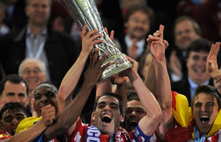 Atletico Madrid fagnaði í gær vel og innilega sigri sínum í Evrópudeild UEFA eftir að hafa lagt Fulham í framlengdum úrslitaleiknum í Hamburg, 2-1. Diego Forlan var hetja Madrídinga í leiknum en hann skoraði bæði mörk liðsins, þar af sigurmarkið undir lok framlengingarinnar. Forlan hafði komið Atletico yfir í fyrri hálfleik en aðeins nokkrum mínútum síðar náði Simon Davies að jafna metin fyrir þá ensku. Allt útlit var fyrir að úrslit myndu ráðast í vítaspyrnukeppni en þá skoraði Forlan sem tryggði Atletico bikarinn góða. Myndir úr leiknum og af fögnuði Spánverjanna má sjá með því að smella á hlekkinn hér fyrir neðan. Diego Forlan var hetja kvöldsins. Hér er hann með bikarinn góða.Hér fagnar Forlan sigurmarki sínu í leiknum.Sergio Agüero átti þátt í báðum mörkum Atletico. Hér er hann í baráttu við Dickson Etuhu og Zoltan Gera, leikmenn Fulham.Roy Hogdson hefur náð góðum árangri með Fulham.Nordic Photos / Getty ImagesStórleikarinn Hugh Grant var á leiknum og hvatti sína menn í Fulham áfram.Þessi stuðningsmaður Atletico lét líka vel í sér heyra.Hér fagnar Forlan eftir að búið er að flauta til leiksloka.Nordic Photos / Getty ImagesLeikmenn Atletico fagna innilega ..... en Paul Konchesky og félagar í Fulham voru niðurbrotnir.Hér fer bikarinn góði á loft.Bikarinn er í öruggum höndum fyrirliðans Antonio Lopez.Danny Murphy var vitanlega svekktur í leikslok.Þjálfarinn Quique Sanchez Flores fékk tolleringu.Atletico Madrid, sigurvegarar í Evrópudeild UEFA árið 2010.