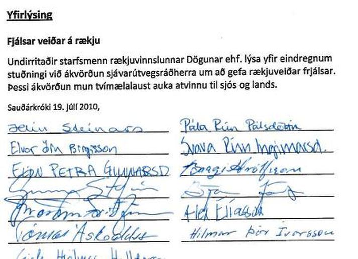 Starfsfólk stærstu rækjuvinnslu á landinu hefur sent frá sér yfirlýsingu til stuðnings ákvörðun sjávarútvegsráðherra um að gefa veiðar á úthafsrækju frjálsar. Framkvæmdastjóri vinnslunnar segir að með ákvörðun ráðherra aukist aðgengi að hráefni sem sé atvinnuskapandi. „Þetta er í sjálfu sér ekkert flókið mál. Með ákvörðun ráðherra mun aðgengi að hráefni aukast og það er gott fyrir atvinnu bæði á sjó og í landi," segir Þröstur Friðfinnsson, framkvæmdastjóri Dögunar sem er rækjuvinnsla á Sauðarkróki. Forsvarsmenn LÍÚ hafa haldið því fram að rækjuvinnsla muni jafnvel leggjast af verði veiðarnar gefnar frjálsar segir Þröstur: „Það eru mjög sérstök rök að ef aðgengi að hráefni batnar leggist vinnsla af. Það er ljóst að öll aukin rækjuveiði við Ísland mun koma þeim rækjuvinnslum sem eru í landinu til góða."Yfirlýsing starfsmanna Dögunar á SauðárkrókiÞröstur gagnrýnir þá umfjöllun sem verið hefur um ákvörðun ráðherra og segir ekki gæta jafnvægis í henni. „Okkur finnst þetta vera ansi einhliða umfjöllun og því miður er ekki talað um hagsmuni vinnslunar af raunsæi. Við hjá Dögun höfum síðustu árin verið stærsta rækjuvinnslan á landinu en aðilar LÍÚ hafa ekki haft áhuga á að tala við okkur eða boða okkur á fundi vegna málsins. Við furðum okkur á því." Þröstur segir að Dögun eigi smávegis af rækjukvóta og muni því tapa einhverju þegar veiðarnar verði gefnar frjálsar. Hann býst hins vegar fastlega við því að bætt aðgengi að hráefni muni vega upp á móti því tapi." Starfsmenn Dögunar hafa allir skrifað undir stuðningsyfirlýsinguna og verður hún send sjávarútvegsráðherra. Þröstur segir mikilvægt að færa umræðuna á vitrænt plan. „Það hafa verið ansi stóryrtar yfirlýsingar frá útgerðarmönnum í fréttum, það er talað um að Byggðastofnun sé í hættu, sem eru mjög hæpin rök. Rækjukvótinn hefur ekki verið veiddur til fulls síðustu tíu árin og kvóti sem enginn vill veiða er ekki verðmætur. Það er engin lánastofnun með viti sem lánar út á verðlausan kvóta."