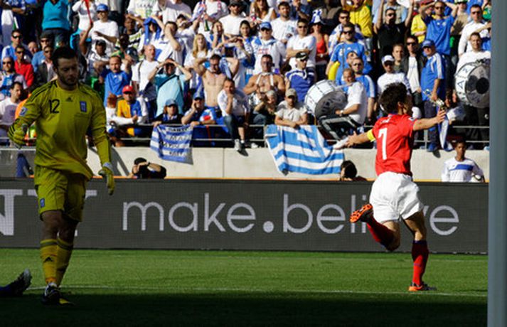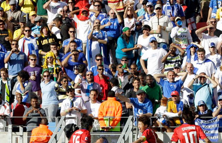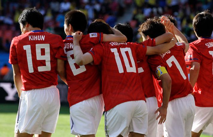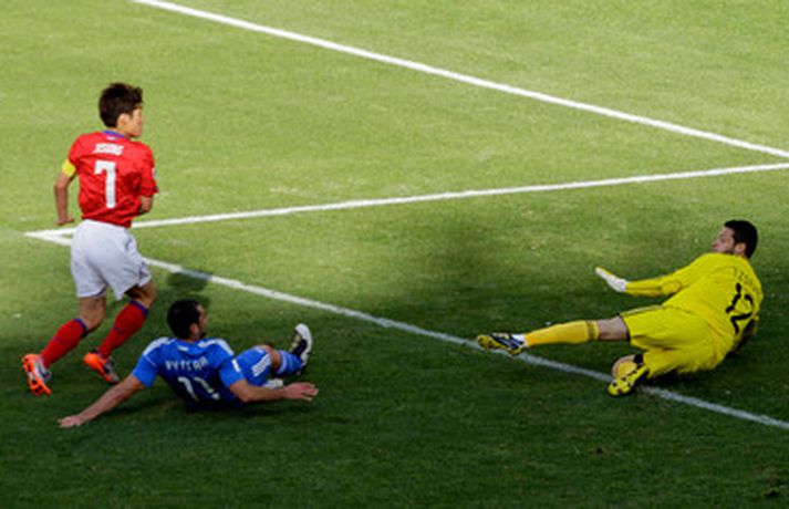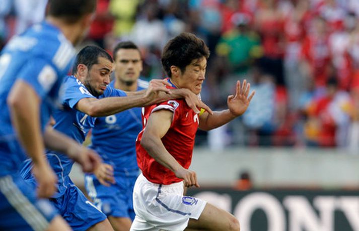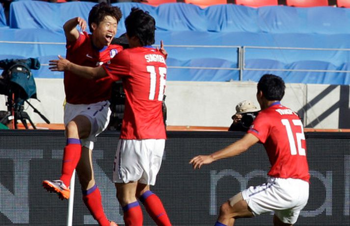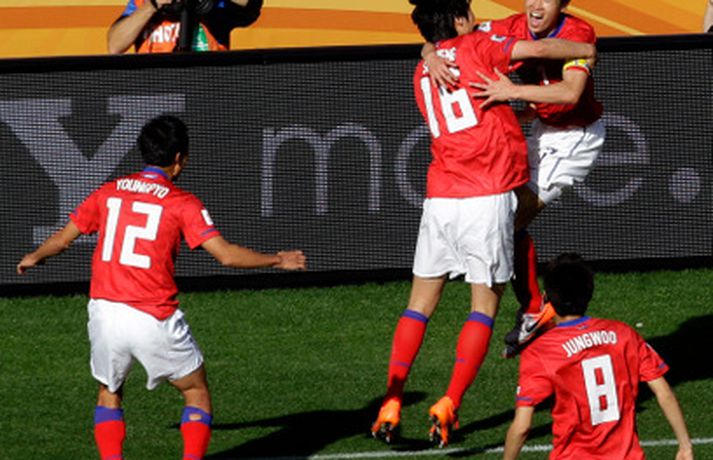 Park Ji-Sung, leikmaður Manchester United og fyrirliði Suður-Kóreumanna á HM í Suður-Afríku, skoraði seinna mark liðsins í 2-0 sigri á Grikkjum í dag. Park hefur þar með skorað í þremur heimsmeistarakeppnum í röð og er fyrstu Suður-Kóreumaðurinn og annar asíski knattspyrnumaðurinn sem afrekar það. Sami Al Jaber frá Sádí-Arabíu var eini knattspyrnumaðurinn frá Asíu sem hafði skorað í þremur heimsmeistarakeppnum. Park Ji-Sung hefur skorað eitt mark í hverri keppni og er nú orðinn markahæsti leikmaður Suður-Kóreu á HM ásamt Ahn Jung-Hwan. Myndir af markinu og fögnuði Suður-Kóreumanna má sjá í albúminu hér að neðan. Hægt er að sjá myndirnar stærri með því að smella á þær. Mynd/APMynd/APMynd/APMynd/APMynd/APMynd/APMynd/APMynd/APMynd/AP