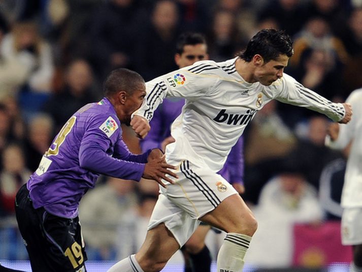 Cristiano Ronaldo: Átti ekki að fá rautt fyrir að nefbrjóta hann Óskar Ófeigur Jónsson skrifar 25. janúar 2010 11:00 Hér sést atvikið þegar Cristiano Ronaldo brýtur nef Patrick Mtiliga. Mynd/AFP Cristiano Ronaldo baðst afsökunar á því að nefbrjóta Patrick Mtiliga, varnarmann Malaga, í spænsku úrvalsdeildinni í gær en þó ekki fyrr en eftir leikinn. Ronaldo skoraði bæði mörkin í 2-0 sigri Real Madrid en var síðan rekinn útaf fyrir að því virtist greinilegt olnbogaskot tuttugu mínútum fyrir leikslok. „Fólk sem horfir á og skilur fótbolta veit að ég er alltaf að reyna að spila fótbolta. Rauða spjaldið var skandall og ég bara skila það ekki," sagði Cristiano Ronaldo eftir leikinn en lék mikinn píslarvott inn á vellinum eftir að hann fékk rauða spjaldið. Í endursýningu af atvikinu lítur þó út fyrir það að Ronaldo hafi gefið Mtiliga olnbogaskot í andlitið og þær sjónvarpsmyndir voru ekki að hjálpa Portúgalanum eða það að dómari leiksins var í frábærri aðstöðu til að meta atvikið eða aðeins nokkrum metrum frá. „Ég fór niður í búningsherbergi Malaga-manna og baðst afsökunar og hann skyldi það sem gerðist. Ég veit að það sáu allir blóð í sjónvarpinu en ég var bara að reyna aðlosa mig. Ég myndi aldrei reyna að meiða einhvern," sagði Ronaldo. Manuel Pellegrini, þjálfari Real Madrid kom Ronaldo til varnar. „Dómarar verða að reyna að átta sig á því hverjir eru að reyna að spila fótbolta og hverjir eru að reyna að koma í veg fyrir að fótbolti sé spilaður. Cristiano vill spila fótbolta og þegar leikmaður heldur honum þá reynir hann að losa sig. Aðrir henda sér niður og reyna að fiska aukaspyrnu," sagði Pellegrini. Spænski boltinn Mest lesið Þessi tíu eru tilnefnd sem Íþróttamaður ársins 2025: 23 ára aldursmunur Sport Sagan ekki sönn: „Veit ekki hvaðan þetta á að hafa komið“ Íslenski boltinn Arsenal í undanúrslit eftir vító Enski boltinn Sakaður um svindl á HM í pílukasti Sport Sakaður um niðurlægingu: „Við viljum ekki hafa hann sem þjálfara“ Handbolti Erfitt að vera í burtu þegar mamma greindist Fótbolti Áfallið staðreynd og Isak búinn í aðgerð Enski boltinn Arnar Daði rekinn frá Stjörnunni en áfram þjálfari kvennaliðsins Handbolti Hættur aðeins þrítugur Golf Sjáðu geggjaðan snúning Alberts áður en hann skoraði frábært mark Fótbolti Fleiri fréttir Kaupmannahafnarbúi afgreiddi Úganda Arsenal í undanúrslit eftir vító Man. Utd reyndi stíft en Semenyo kaus City Iwobi og Lookman áberandi í sigri Nígeríu „Tölfræðilega séð eiga þeir ekkert að vera í þessari stöðu“ Amanda hætt hjá Twente Jackson hóf Afríkumótið með látum Fullkrug leysir Origi af í Mílanó Versta tímabil Vinícius í mörg ár og samningaviðræður sigla í strand Kongóliðar byrja á sigri Glódís framlengir samninginn við Bayern Chelsea setur sig í samband við Semenyo Sagan ekki sönn: „Veit ekki hvaðan þetta á að hafa komið“ Hætt við að spila í Ástralíu en óvíst hvar leikurinn verður Neymar kominn á lappir og lofar að skora í úrslitaleik HM Jiménez jafnaði bestu vítaskyttu sögunnar Slot mun sakna Isak í tvo mánuði eftir „glórulausa tæklingu“ Sjáðu „auma“ vítið sem skilaði Fulham sigri Erfitt að vera í burtu þegar mamma greindist „Svona lítur frábær ákvörðun út“ Einn leikmaður með samning og völlurinn ólöglegur Salah færði Egyptum draumabyrjun Fulham skildi Forest eftir við fallsvæðið Áfallið staðreynd og Isak búinn í aðgerð Neres hetja Napoli í Sádi-Arabíu Aron Einar lagði upp dýrmætt sigurmark Afkáralegt fagn hjá hetju Sambíu Glódís Perla veik í jólafríið en enn taplaus Glódís og Hákon best í fótboltanum á árinu Frelsaði fjárfestirinn Dani Alves gefur sjálfum sér samning Sjá meira