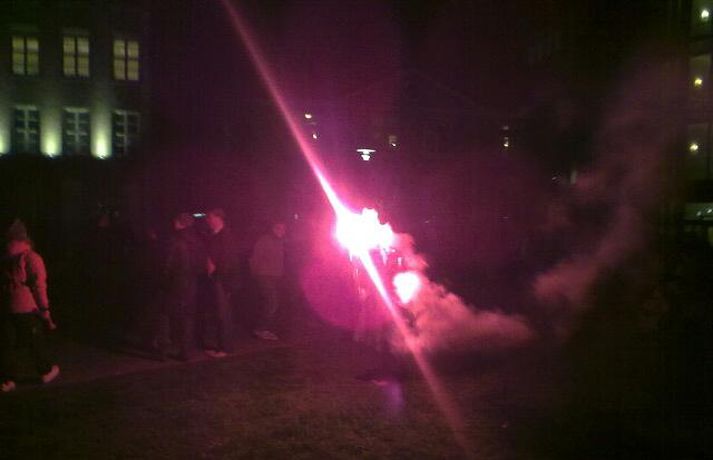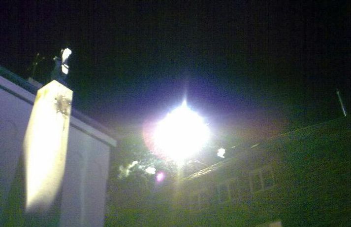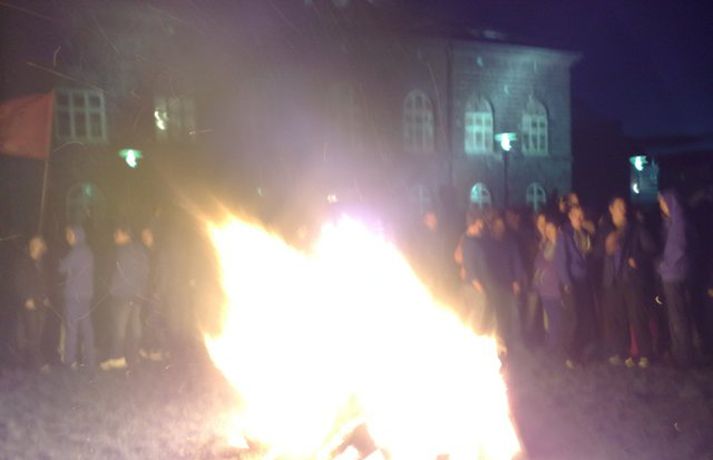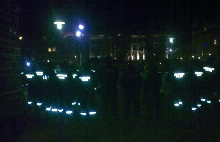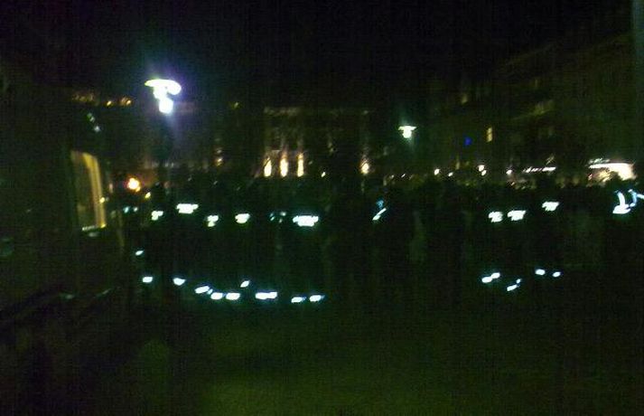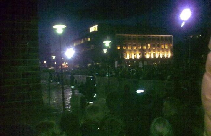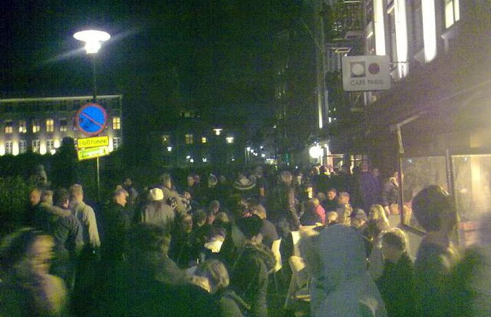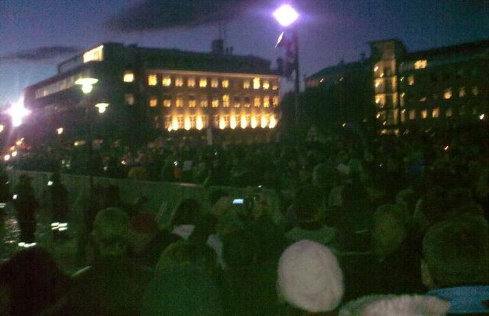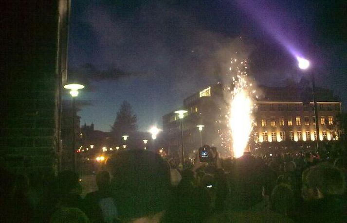 Tónlistarmaðurinn Páll Óskar Hjálmtýsson er einn hinna fjölmörgu sem mættir eru fyrir utan Alþingishúsið á Austurvelli. Hann ber þar pönnu með sleif, taktfastur að vanda. Ljósmyndari Vísis náði mynd af Páli Óskari með pönnuna rétt í þessu. Sjá má hana í myndasafninu hér að neðan auk annarra mynda sem fanga andrúmsloft kvöldsins í miðbænum. Þær eru ýmist teknar á síma eða myndavél. Þarna má sjá flugelda springa yfir Alþingishúsinu, elda brenna á Austurvelli, tunnutrommara, óeirðarlögreglu og fleira.