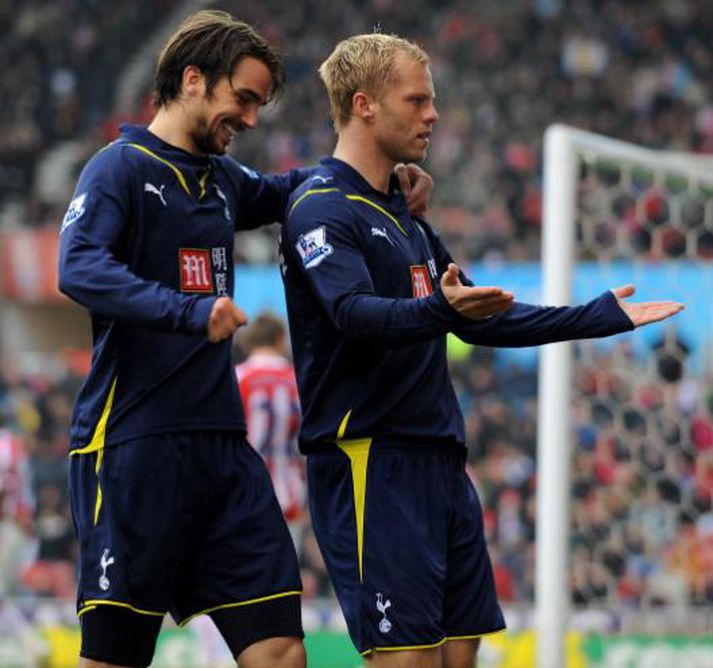 Eiður Smári skoraði í sigri Tottenham á Stoke Elvar Geir Magnússon skrifar 20. mars 2010 16:20 Eiður Smári og Niko Kranjcar skoruðu fyrir Tottenham í dag. Tottenham gerði góða ferð á heimavöll Stoke í dag og vann 2-1 sigur. Eiður Smári Guðjohnsen skoraði fyrra mark Tottenham. Þetta var fyrsta mark Eiðs í búningi Tottenham og fyrsta mark hans í ensku úrvalsdeildinni í fjögur ár. Eiður byrjaði á bekknum en kom inn fyrir Roman Pavlyuchenko sem meiddist á 35. mínútu. Hann skoraði eftir 21 sekúndu í seinni hálfleik eftir sendingu frá Peter Crouch. Hann skaut föstu skoti upp í þaknetið, laglegt mark. Á 49. mínútu fékk Dean Whitehead, leikmaður Stoke, að líta rauða spjaldið. Einum færri náði Stoke að jafna á 63. mínútu en þá fékk liðið vítaspyrnu. Matthew Etherington tók spyrnuna og skoraði. Stoke fékk nokkur góð færi til að komast yfir en þau nýttust ekki og fyrir það refsaði Niko Kranjcar með því að skora sigurmarkið á 77. mínútu. Enski boltinn Mest lesið Sakaður um svindl á HM í pílukasti Sport Bunting dró orð sín til baka með tárin í augunum: „Ég er ekki meistari fólksins“ Sport Áhorfendur ærðust eftir mögulega mark mótsins í fyrsta leik Fótbolti Óskar Hrafn um komu Arnórs Ingva: „Gífurlega dýrmætt fyrir KR“ Íslenski boltinn Sjáðu geggjaðan snúning Alberts áður en hann skoraði frábært mark Fótbolti Ótrúleg tíðindi á HM í pílukasti: „Mikið sjokk“ Sport Óttast að Isak hafi fótbrotnað Enski boltinn Hleður Kjartan lofi eftir frábæra frumraun með Aberdeen Fótbolti Klappstýrur Björgvins Karls slógu í gegn Sport Í bann fyrir að kasta flösku í barn Körfubolti Fleiri fréttir Sjáðu mörkin: Rogers sá um Manchester United Óttast að Isak hafi fótbrotnað Tvenna frá Rogers tryggði Villa sigur gegn Manchester United Fimmta sinn sem Arsenal er á toppnum um jólin: Unnu ekki titilinn í fyrstu fjögur skiptin „Viljum við að okkar verði minnst fyrir að vera skræfur?“ „Ef dómarinn hefði sinnt sínu starfi almennilega hefði Romero ekki fengið spjald“ Haaland gaf barnabarni Hareide gjöf Sjáðu mörkin úr enska: Sviptingar, sænskt þema og svakalegar tæklingar Calvert-Lewin hættir ekki að skora Gyökeres skaut Arsenal aftur á toppinn Slot fámáll um stöðuna á Isak Gleði og sorg í sigri Liverpool Dramatík er Broja reyndist hetja Burnley Haaland frábær er Manchester City komst á toppinn Andri Lucas skoraði í langþráðum sigri Blackburn Chelsea vann upp tveggja marka forskot á St James' Park Ekkert fararsnið á Guardiola sem segir að City verði að vera undirbúið Tíu bestu mörkin úr leikjum Liverpool og Tottenham Salah bað samherjana afsökunar Lineker fokillur við blaðamann: „Þvílíkt kjaftæði“ Skírði soninn LFC og Mac Allister lét draum feðganna rætast Jóga og pílates lykillinn að snöggri endurkomu Fantasýn: „Hann setti allt á 3 og það kom upp 19“ Alexander Isak fékk sænska gullboltann „Salah líkaði ekki að vera í skugganum af Isak og Wirtz“ Amorim vill Neves Benti á hinn íslenska Dan Burn Lést á leiðinni heim úr fótboltaleik Forsætisráðherrann hótar Roman Abramovich og segir að „klukkan tifi“ „Sýnum kvennaíþróttir af því að þær eru frábærar“ Sjá meira