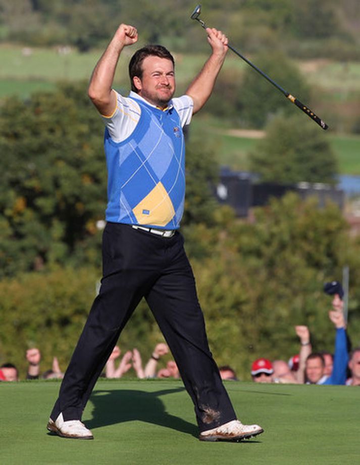 Evrópa vann Ryder-bikarinn Eiríkur Stefán Ásgeirsson skrifar 4. október 2010 14:37 Graeme McDowell tryggði Evrópu sigur í Ryder-keppninni. Hér fagnar hann fuglinum mikilvæga á sextándu. Nordic Photos / Getty Images Keppnislið Evrópu vann í dag lið Bandaríkjanna í Ryder-keppninni í golfi með minnsta mögulega mun - fjórtán og hálfum vinningi gegn þrettán og hálfum. Það var Norður-Írinn Graeme McDowell sem tryggði Evrópu sigurinn með því að vinna síðustu viðureignina í einlilðaleiknum, gegn Hunter Mahan. McDowell náði afar mikilvægum fugli á sextándu holu er hann setti niður fimm metra pútt og náði þar með tveggja stiga forystu gegn Mahan þegar tvær holur voru eftir. Hefði Mahan náð að jafna McDowell að stigum og þar með hálfum vinningi hefði niðurstaðan orðið jafntefli, 14-14. En þar sem Bandaríkin er núverandi handhafi titilsins hefði liðið haldið honum með jafntefli. En McDowell tryggði sigurinn á sautjándu holu og út braust gríðarlegur fögnuður meðal leikmanna og stuðningsmanna Evrópuliðsins. Evrópa hóf leikinn í dag með þriggja vinninga forystu og þurftu því fimm og hálfan vinning úr síðustu tólf viðureignunum sem eftir voru þegar keppni hófst. Bandaríska liðið náði hins vegar að jafna metin þegar að Rickie Fowler náði fjórum fuglum á síðustu fjórum holunum í sinni viðureign gegn Edoardo Molinari. Þar með jafnaði hann metin í 13,5-13,5. En sem fyrr segir náði McDowell, sem fagnaði sigri á opna bandaríska meistaramótinu í ár, að tryggja Evrópuliðinu titilinn með sigri í lokaviðureign keppninnar. Þetta er mikill sigur fyrir Skotann Colin Montgomerie sem var fyrirliði evrópska liðsins í ár. Golf Mest lesið Sjáðu geggjaðan snúning Alberts áður en hann skoraði frábært mark Fótbolti Bunting dró orð sín til baka með tárin í augunum: „Ég er ekki meistari fólksins“ Sport Sakaður um svindl á HM í pílukasti Sport Táningur fær mikið hrós fyrir viðbrögð sín þegar mótherji missti meðvitund Fótbolti Áhorfendur ærðust eftir mögulega mark mótsins í fyrsta leik Fótbolti Klappstýrur Björgvins Karls slógu í gegn Sport Óskar Hrafn um komu Arnórs Ingva: „Gífurlega dýrmætt fyrir KR“ Íslenski boltinn Stórstjarna úr WNBA-deildinni í heimsókn á Íslandi Körfubolti „Ef þið væruð Antoine Semenyo, hvert mynduð þið fara?“ Enski boltinn Guardiola mun vigta leikmenn Man City eftir jólin Enski boltinn Fleiri fréttir Guðrún Brá tveimur höggum frá því að öðlast fullan keppnisrétt á LET Mótið hálfnað og Guðrún Brá enn í góðri stöðu Guðrún Brá efst eftir fyrsta hring í Marokkó Íslensku stelpurnar misstu einn keppnisdag vegna eldingarhættu Áminntir fyrir að drekka einn bjór: Sagðir drukknir og hafa tekið „Happy Gilmore-sveiflu“ Ástand í Noregi: Hátt upp í fimm þúsund kylfingar án klúbbs Bananahýði gerði Rory McIlroy erfitt fyrir Dáður en umdeildur kylfingur látinn Gríðarleg fjölgun kylfinga: „Aðstaðan sprungin í höfuðborginni“ Barnabarn Donalds Trump: „Ég sló mörg góð högg, bara á ranga staði“ Vildi ekki svara spurningum um afa sinn, Donald Trump Tóku símana af stelpunum alla keppnisferðina Sjá meira