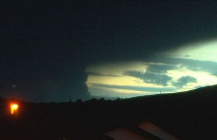 Gosmökkurinn frá Eyjafjallajökli sást vel frá Vestmannaeyjum í gær. Að sögn Gísla Óskarssonar fréttaritara í Vestmannaeyjum virtist sem öskuskýið breiddi úr sér eins og sveppahattur út frá stróknum. Nokkur aska féll í nótt eins og sjá mátti á þeim stöðum sem höfðu verið hreinsaðir af ösku sem féll gær. Laust yfir hálf ellefu í morgun mátti sjá hvernig öskuskýið breiddi sig út frá eldstöðinni að Vestmannaeyjum og suður fyrir þær. Skýið dróst síðan hægt til norðurs og yfir Heimaey. Nú er dimmt öskumistur yfir kaupstaðnum með tilheyrandi öskufalli. Gísli fréttaritari segir að það logi ljós á öllum ljósastaurum og jafnframt loga ljós inni í mörgum húsanna. Gísli Óskarsson tók myndirnar sem fylgja þessari frétt.