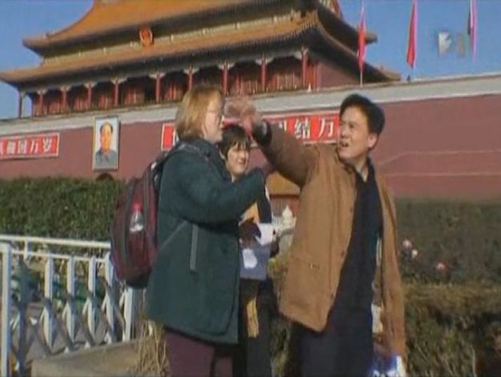 Olli upphlaupi á Torgi hins himneska friðar 22. nóvember 2010 23:35 Þrettán ára amerískur strákur olli upphlaupi á Torgi hins himneska friðar í Peking í dag þegar hann breiddi út borða þar sem þess var krafist að hlutlausa svæðið á landamærum Norður- og Suður-Kóreu yrði gert að friðargarði. Lögreglumaður reif borðann úr höndum hans og bannaði nærstöddum að taka myndir. Strákurinn og fjölskylda yfirgáfu svo Kína síðdegis í dag, en ekki er vitað hvort þau voru rekin úr landi. Mest lesið „Ég hef aldrei upplifað annan eins harm“ Innlent Gaf fingurinn á Miklubraut Innlent Hrindir af stað söfnun fyrir móður stúlkunnar sem lést í Suður-Afríku Innlent Breiddi út faðminn fyrir rasista: „Þið þurfið ekki að biðjast afsökunar á að vera hvít lengur“ Erlent Hundrað og fjörutíu milljarða bótakrafa á Samherja sé súrrealísk Innlent „Þetta hefur verið þungur tími“ Innlent Sprengdu rússneskan hershöfðingja í loft upp í Moskvu Erlent Appelsínugular og gular viðvaranir á aðfangadag Veður Nýr ritstjóri stöðvaði umfjöllun um brottvísanir Trump Erlent Undirbúningur árásarinnar stóð yfir í marga mánuði Erlent Fleiri fréttir Nýr ritstjóri stöðvaði umfjöllun um brottvísanir Trump Breiddi út faðminn fyrir rasista: „Þið þurfið ekki að biðjast afsökunar á að vera hvít lengur“ Sprengdu rússneskan hershöfðingja í loft upp í Moskvu Undirbúningur árásarinnar stóð yfir í marga mánuði Trump skipar sendifulltrúa fyrir Grænland Segir unnið að því að móta sameiginlega nálgun Bandaríkjanna, Úkraínu og Evrópu Sýknaður af nauðgun eftir að hafa verið skimaður fyrir sjaldgæfri svefnröskun Málið sem Trump getur ekki losað sig við Grunaður um manndráp eftir að tveggja ára drengur féll úr blokk Fóru um borð í vélvana rússneskt skip Baulað á Albanese á minningarathöfn á Bondi-strönd Kvarta yfir ritskoðun Epstein-skjala: „Við vitum ekki hvað við vitum ekki“ Níu skotnir til bana á krá Sextán ára fékk greitt fyrir að færa Epstein stúlkur Ljósmyndir horfnar úr Epstein-skjölunum, þar á meðal ein af Trump Vilja dauðarefsingu af borðinu vegna hagsmunaáreksturs ráðherra Pútín sagður hafa valið Witkoff Gerðu umfangsmiklar árásir gegn ISIS í Sýrlandi Það helsta úr fyrsta skammti Epstein-skjalanna Epstein-skjölin birt Draga tilvist neðanjarðarhafs á Títan í efa Réðust á skip úr skuggaflotanum þúsundir kílómetra frá Úkraínu Enn fleiri myndir úr safni Epsteins: „En hún vill þúsund dali fyrir hverja stúlku“ Trump vill til tunglsins fyrir 2028 Herða reglur og ráðast í endurkaup á skotvopnum Morðinginn í Brown háskóla fannst látinn Evrópa samþykkir 90 milljarða evra lán til Úkraínu Rannsaka tengsl skotárásarinnar við annað morð Sex um borð í einkaþotu sem hrapaði Beita dómara ICC refsiaðgerðum vegna Ísrael Sjá meira