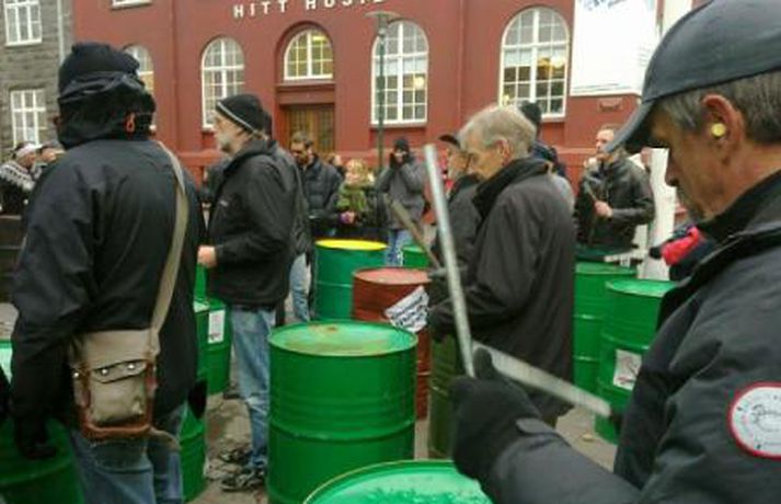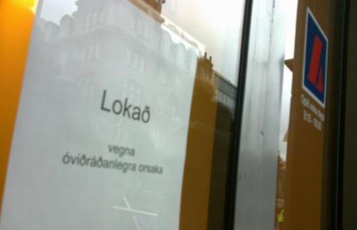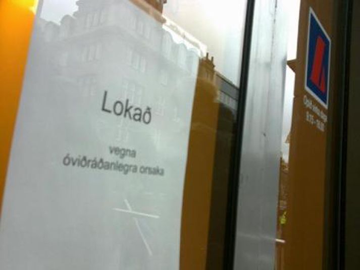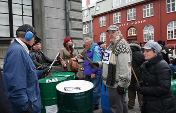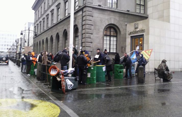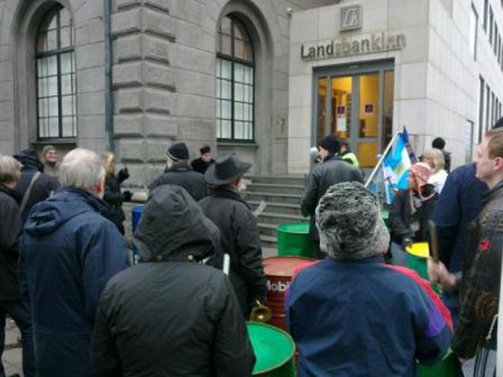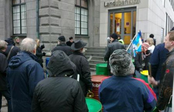 Um fimmtíu manns mættu fyrir framan Landsbankann í Austurstræti í dag klukkan tvö til að mótmæla framferði bankanna. Mótmælendur segja þá standa í vegi fyrir því að kjör almennings verði leiðrétt, eins og fram kemur tilkynningu frá aðstandendum. MYND/Friðrik Þór Mótmælin fóru friðsamlega fram en mikill hávaði skapaðist þegar barið var á tunnur. Bankanum var hinsvegar lokað en skilti hafði verið sett upp þar sem stóð að lokað væri „vegna óviðráðanlegra orsaka."MYND/Friðrik ÞórMYND/Friðrik ÞórMYND/Friðrik ÞórMYND/Friðrik Þór