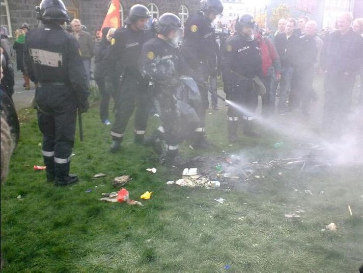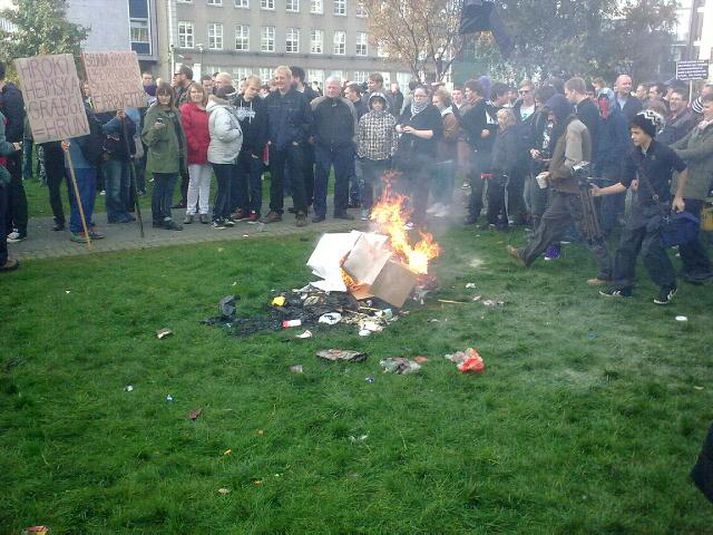Kveikja bál á Austurvelli - myndir 1. október 2010 15:33 Fyrsta bálið var heldur smátt Myndir: GRV Nokkrir mótmælendur tóku sig saman og tendruðu lítið bál við Austurvöll fyrir skemmstu. Lögreglulið var enn vel mannað við Alþingishúsið eftir mótmælin og bar lögreglumenn fljótt að bálinu og slökktu það. Lögreglan slökkti eldinn fljótt Mótmælendurnir létu það lítið á sig fá og kveiktu skjótt annan eld. Eftir því sem fréttastofa kemst næst eru um fjögur hundruð manns enn á Austurvelli en á annað þúsund voru þar saman komin þegar Alþingi var sett fyrr í dag. Mótmælendur kveiktu þá annan eld Mótmælin hafa að mestu farið friðsamlega fram. Svo virðist þó sem hiti sé tekinn að færast í leikana með tilheyrandi báli. Mest lesið Töframaður lúbarinn í Garðabæ: „Ég hélt að þetta væri búið“ Innlent „Ég spyr hvernig hefði farið ef ég hefði ekki lifað þetta af“ Innlent „Liggur maður þarna á jörðinni og það var verið að berja hann í stöppu“ Innlent Hljóp upp í fjall eftir árekstur og neitaði að koma niður Erlent Björg sökuð um brot á kosningareglum Viðreisnar Innlent „Koma einhverjir strákar og svo fer allt í háaloft“ Innlent Vaktin: Björg Magnúsdóttir leiðir lista Viðreisnar í borginni Innlent Segir af sér þingmennsku að ákveðnu skilyrði uppfylltu Innlent „Dorrit og eiginmaður hennar frá Íslandi eru hér“ Innlent Fjöldi ásakana um brot gegn barnungum stúlkum Erlent Fleiri fréttir Gagnagrunnur heimilisfanga ICE-liða hýstur á Íslandi Dyravörður tók gest kverkataki Geta stórbætt þjónustu fyrir þau sem greinast með krabbamein Segir af sér þingmennsku að ákveðnu skilyrði uppfylltu Sáttamiðlun úrræði sem væri alls ekki fyrir alla þolendur Spennt að mæta fyrrverandi yfirmanni í kappræðum Dagur kvenfélagskonunnar er í dag 1. febrúar Líkurnar á lækkun „mjög litlar“ Mótmæla og biðla til utanríkisráðherra Nýir oddvitar og sáttameðferð í kynferðisbrotamálum Töframaður lúbarinn í Garðabæ: „Ég hélt að þetta væri búið“ Listamenn safna fyrir 10 ára dreng á Selfossi í dag „Ég spyr hvernig hefði farið ef ég hefði ekki lifað þetta af“ Sprengisandur: Laxeldi, verðbólga og falsfréttir Grunaður um stórfellda líkamsárás „Á yfir höfði sér kærur vegna fjölda umferðarlagabrota“ Ölvuð kona grunuð um að valda umferðarslysi á rafhlaupahjóli Hlýnandi veður í dag og „meinlaus austanlægð“ í kortunum Hilmar Gunnarsson er oddviti í Mosfellsbæ Vilhjálmur Árnason leiðir Sjálfstæðismenn í Reykjanesbæ Baráttan hafi verið Viðreisn til sóma „Lúxusvandamál“ að velja og hafna á listann Stöðvuðu stolinn bíl með naglamottu eftir eftirför um alla borg Sjálfstæðismenn í Reykjanesbæ velja sér oddvita „Vinna er heilsuefling“ Björg sökuð um brot á kosningareglum Viðreisnar Blótað í Grindavík á nýjan leik Vaktin: Björg Magnúsdóttir leiðir lista Viðreisnar í borginni „Liggur maður þarna á jörðinni og það var verið að berja hann í stöppu“ Vilja Hjallastefnugrunnskóla í Árborg Sjá meira