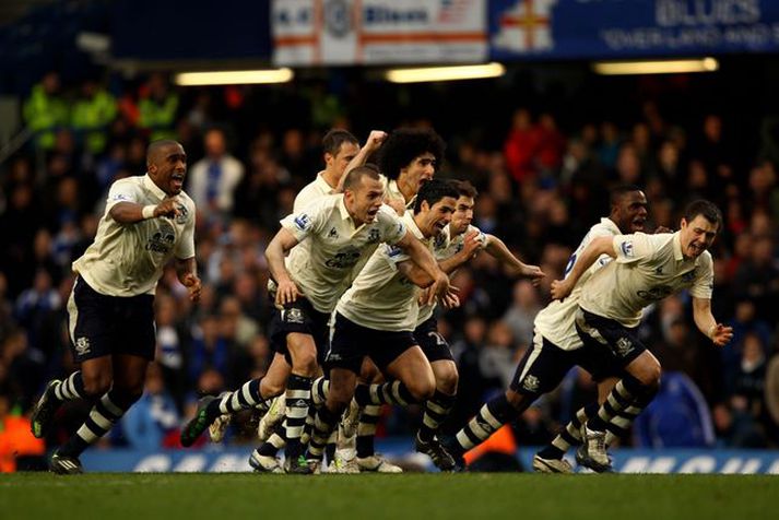 Neville hetja Everton sem sló út Chelsea Stefán Árni Pálsson skrifar 19. febrúar 2011 16:46 Nordic Photos / Getty Images Everton bar sigur úr býtum gegn Chelsea í fjórðu umferð ensku bikarkeppninnar í dag en úrslitin réðust ekki fyrir en í vítaspyrnukeppni. Staðan var 0-0 eftir venjulegan leiktíma en bæði liðin náðu að skora í framlengingunni og því lauk leiknum með 1-1 jafntefli. Það var Phil Neville sem var hetja Everton en hann skoraði úr síðustu vítaspyrnu Everton og kom liðinu áfram. Liðin mættust 29. janúar í fjórðu umferð enska bikarsins og þá fóru leikar jafnt 1-1, því þurfti annan leik til að ná fram úrslitum. Fyrri leikurinn fór fram á Goodison Park, heimavelli Everton, en í dag var leikið Stamford Bridge. Fernando Torres var ekki í leikmannahópi Chelsea í dag en hann lék með Liverpool í sömu keppni fyrr á þessu tímabili og var því ekki gjaldgengur fyrir Lundúnaliðið. Chelsea hafði ekki skorað mark í síðustu tveimur leikjum liðsins sem verður að teljast virkilega sjaldgæft. Heimamenn réðu lögum og lofum í fyrri hálfleik og fengu mörg færri til þess að skora en inn vildi boltinn ekki. Florent Malouda, leikmaður Chelsea, lék virkilega vel í fyrri hálfleiknum og Seamus Coleman, hægri bakvörður Everton, virtist ekkert ráða við hraðann hjá Frakkanum. Heimamenn vildu fá vítaspyrnu rétt fyrir lok fyrri hálfleiks þegar Tim Howard virtist brjóta á Ramires, leikmanni Chelsea, sem var sloppinn einn í gegn en í staðin fékk Ramires gult spjald fyrir leikaraskap. Virkilega umdeildur dómur en líklega átti dómarinn að dæma vítaspyrnu. Mark frá Chelsea lá heldur betur í loftinu í byrjun síðari hálfleiks en boltinn hreinlega neitaði að fara inn fyrir marklínuna. Tim Howard varði oft á tíðum meistaralega í marki Everton. Tveimur mínútum fyrir lok venjulegs leiktíma náði Marouane Fellaini, leikmaður Everton, að skora mark sem var dæmt af vegan rangstöðu. Everton-menn spýttu heldur betur í lófana undir lokin og pressuðu stíft að marki Chelsea. Eftir venjulegan leiktíma var enn jafnt og því þurfti að framlengja. Þegar um 13 mínútur voru liðnar af framlengingunni náðu heimamenn í Chelsea loksins að koma boltanum í markið. Boltinn barst til Frank Lampard inn í vítateig og enski landsliðsmaðurinn skoraði með laglegu skoti. Everton-menn neituðu aftur á móti að gefast upp og þegar ein mínúta var eftir af framlengingunni fékk Everton aukaspyrnu á hættulegum stað. Leighton Baines, leikmaður Everton, gerði sér lítið fyrir og skoraði beint úr aukaspyrnunni og hélt lífi í liði sínu. Vítaspyrnukeppni var því staðreynd. Vítaspyrnukeppnin var æsispennandi, en það var reynsluboltinn Phil Neville sem var hetja Everton þegar hann skoraði úr síðustu spyrnu Everton og kom sínu liði áfram í fimmtu umferð ensku bikarkeppninnar. Ashley Cole hafði áður misnotað síðustu spyrnu Chelsea.Vítaspyrnukeppnin: Chelsea – Frank Lampard skoraði Everton – Leighton Baines lét Peter Cech verðja frá sér Chelsea – Didier Drogba skoraði Everton – Phil Jagielka skoraði Chelsea –Tim Howard varði meistaralega frá Nicolas Anelka Everton – Mikel Arteta skoraði örugglega Chelsea – Mikel Essien skoraði Everton – Johnny Heitinga skoraði Chelsea - Ashley Cole skaut langt yfir markið Everton – Phil Neville skoraði örugglega, Everton sigraði vítaspyrnukeppnina 4-3 Mest lesið Hafnaði 34 milljónum: „Vil ekki styðja kerfi sem býr til fíkn og eyðileggur líf“ Sport Segir starfið í húfi hjá Alfreð Handbolti Sjáðu fyrsta mark Wirtz, laglega sjálfsmarkið og Watkins stúta Chelsea Enski boltinn Littler sjóðheitur en sá fjórði besti varð fyrir áfalli Sport Liverpool-skotmarkið ekki á förum í janúar Enski boltinn Salah sakaður um dýfu: „Getum ekki keppt við Egypta og dómarana“ Fótbolti Haukur náði hundrað og hundrað fyrir EM Handbolti Arnar Þór ráðinn til FIFA: „Himinlifandi að hafa fengið þetta starf“ Fótbolti Aldrei spilað þarna en sagði strax já Enski boltinn Dagskráin í dag: Messan, meistarar Víkings, píla og NFL-veisla Sport Fleiri fréttir Sjáðu magnaða vörslu Raya: „Þetta var stórkostlegt“ Sjáðu fyrsta mark Wirtz, laglega sjálfsmarkið og Watkins stúta Chelsea Liverpool-skotmarkið ekki á förum í janúar Aldrei spilað þarna en sagði strax já „Viss um að ég myndi skora einn daginn“ Watkins hélt ótrúlegri sigurgöngu Villa áfram Schade og Jiménez sendu Brentford og Fulham í efri hlutann Arsenal aftur á toppinn Fyrsta mark Wirtz í þriðja sigrinum í röð Cherki aðalmaðurinn í sigri City Úlfarnir heiðruðu minningu Jota Andri Lucas frá í mánuð Sjáðu dönsku þrumuna sem færði United-mönnum öll þrjú stigin Segir að Arsenal stefni á sögulega fernu á þessu tímabili Amorim endaði viðtalið á gamansömum nótum „Við eigum heima í Evrópu“ Daninn skaut Man. United upp fyrir Liverpool Amorim segir strákinn í frystinum vera framtíðin hjá Man. United Martinez með fyrirliðabandið og báðir Fletcher-bræðurnir á bekknum Havertz gæti snúið aftur á næstu dögum Alfons og Willum sáu tvö rauð spjöld fara á loft Synir Diogo Jota leiða leikmenn út á Anfield Cunha vill skemmta og Howe treystir leikmönnum United horfir til Þýskalands eftir höfnun Semenyo Haaland stóðst vigtun eftir jólin Hápunktarnir hingað til í enska boltanum Goðsögn fallin frá Kærður af knattspyrnusambandinu Bestu jólamörkin: Drogba, Scholes eða Giroud? Van de Ven bað Isak afsökunar: „Vildi ekki meiða hann“ Sjá meira