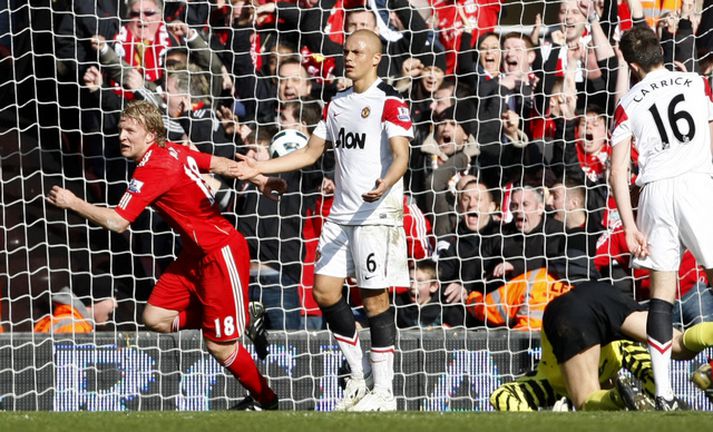 Dirk Kuyt skoraði sína fyrstu þrennu fyrir Liverpool þegar liðið vann öruggan 3-1 sigur á toppliði Manchester United á Anfield í dag í stórleik helgarinnar í ensku úrvalsdeildinni. Liverpool-maður hafði ekki skorað þrennu á móti erkifjendunum í Manchester United síðan að Peter Beardsley skoraði þrennu í 4-0 sigri Liverpool á Anfield í september 1990. Þá líkt og nú sat Kenny Dalglish í stjórastólnum hjá Liverpool. Manchester United átti möguleika á því að ná sex stiga forskoti á Arsneal en nú munar aðeins þremur stigum á liðunum. United var þarna að tapa sínum öðrum leik í röð og hefur jafnframt tapað þremur af síðustu fimm leikjum sínum í ensku deildinni. Þetta er þriðja árið í röð sem Liverpool vinnur Manchester United á Anfield en liðið vann 2-0 í fyrra og 2-1 tímabilið þar á undan. Luis Suarez átti eins og Kuyt stórleik í Liverpool sókninni en hann átti stóran þátt í öllum þremur mörkunum. Vinnusemi félaganna var líka til mikillar fyrirmyndar og gerðu þeir United-mönnum lífið leitt í allan dag. Leikurinn byrjaði leikinn frábærlega og Luis Suarez fór illa með dauðafæri eftir aðeins þriggja mínútna leik eftir að hafa fengið sendingu frá Raul Meireles. Liverpool byrjaði leikinn mun betur en Dimitar Berbatov komst næst þó að skora þegar hann skaut í stöngina á 16. mínútu. Luis Suarez var í miklum ham í fyrri hálfleiknum og á 34. mínútu fór hann framhjá hálfu Manchester United liðinu áður en hann sendi boltann framhjá Edwin van der Sar. Boltinn var á leiðinni í markið þegar Dirk Kuyt sparkaði honum í markið af marklínunni. Suarez var ekki hættur að rugla varnarmenn United í ríminu því eftir fyrirgjöf frá honum gerði Nani þau risa mistök að skalla boltann aftur inn í markteiginn þar sem Dirk Kuyt var dauðafrír og skallaði boltann í markið. Liverpool var því komið í 2-0 eftir 39 mínútur og með öll tök á leiknum. Það ætlaði allt að sjóða upp úr í lok fyrri hálfleiks þegar Jamie Carragher fékk gult spjald fyrir brot á Nani. United-menn vildu fá rautt en Nani var borinn af velli og spilaði ekki meira í leiknum. Rafael svaraði með tveggja fóta tæklingu á Martin Skrtel sem brást illa við. Þeir fengu báðir gult.Mynd/APManchester United byrjaði seinni hálfleikinn af miklum krafti og tók öll völd á vellinum. Raul Meireles bjargaði á marklínu frá Dimitar Berbatov á 59. mínútu og skömmu síðar fékk United aukaspyrnu á stórhættulegum stað en Ryan Giggs átti þá slakt skot yfir. Liverpool stóðst áhlaup United og Dirk Kuyt innsiglaði síðan þrennuna sína og kom Liverpool í 3-0 á 65. mínútu. Kuyt var þá enn á ný á réttum stað þegar hann fylgdi á eftir þegar Edwin van der Sar hálfvarði fasta aukaspyrnu frá Luis Suarez. Andy Carroll kom inn á sem varamaður fyrir Raul Meireles á 74. mínútu í sínum fyrsta leik síðan Liverpool keypti hann á 35 milljónir punda. Liverpool var með góð tök á leiknum eftir að þeir komust í 3-0 og fengu nokkur færi til þess að bæta við mörkum. Það var hinsvegar Manchester United sem minnkaði muninn í uppbótartíma þegar Javier Hernández skallaði boltann inn eftir sendingu frá Ryan Giggs.