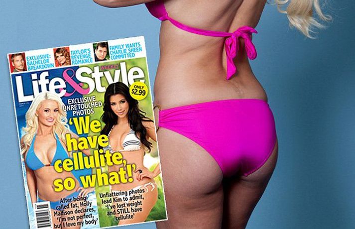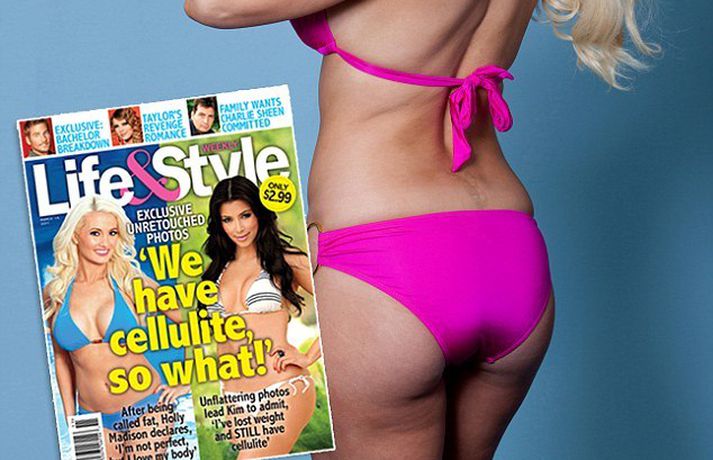 Fyrrum Playboykanínan Holly Madison, 32 ára, prýðir forsíðu tímaritsins Life & Style þessa vikuna ásamt Kim Kardashian eins og sjá má í meðfylgjandi myndasafni. Þar ræðir Holly opinskátt um líkama sinn og þá sér í lagi appelsínuhúðina en í blaðinu er mynd af henni léttklæddri sem ekki er búið að laga til með tölvutækninni. „Ég vil frekar vera í þyngri kantinum með mjúkar línur heldur en þvengmjó með engar kvenlegar línur. Ég er stolt af líkama mínum," segir Holly. „Já ég er með appelsínuhúð. Meira að segja þegar ég var sem grennst þá var ég með appelsínúð líka. Eftir að ég flutti til Las Vegas bjó ég á hótelsvítu þar sem ég pantaði alltaf mat upp á herbergi. Ég elska mat allt of mikið til að vera stöðugt í megrun. Franskar kartöflur eru uppáhaldið mitt." „Ég hef alltaf verið með flottan afturenda og kýs að halda honum með appelsínuhúð og öllu sem honum fylgir," segir hún einnig.