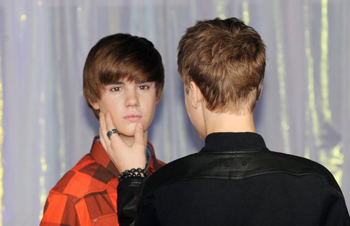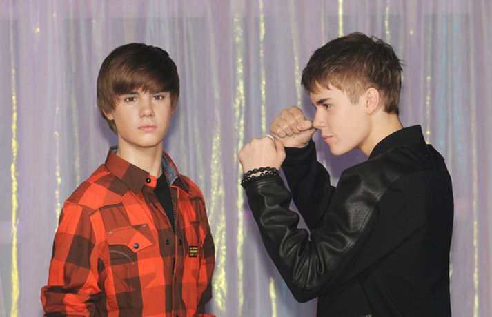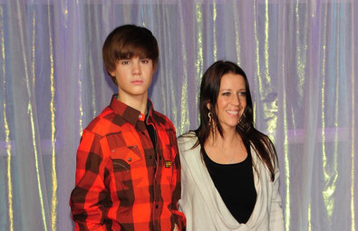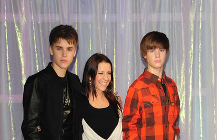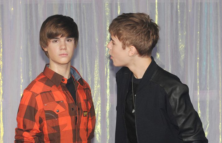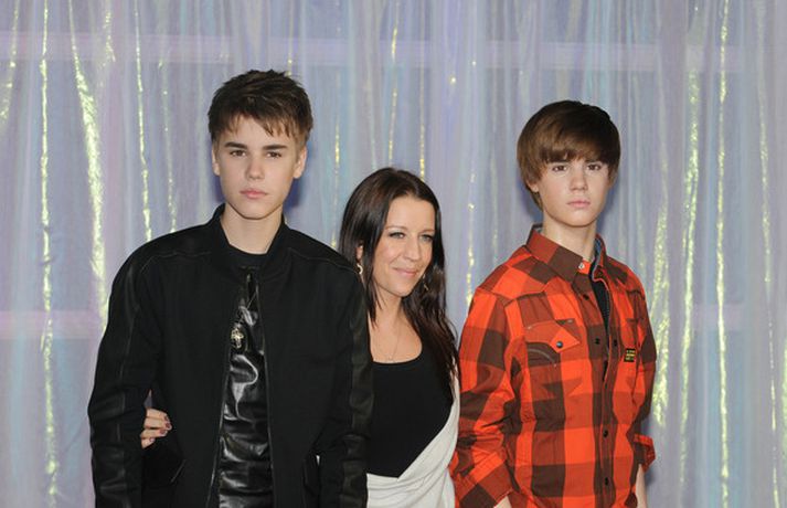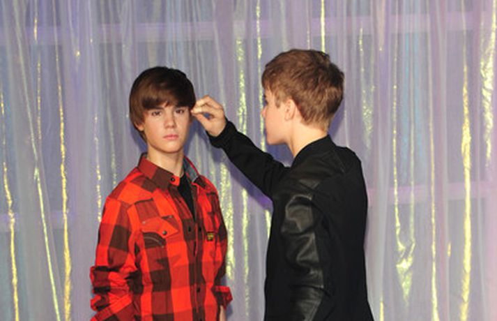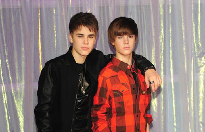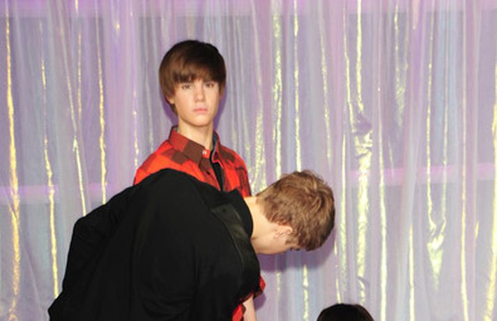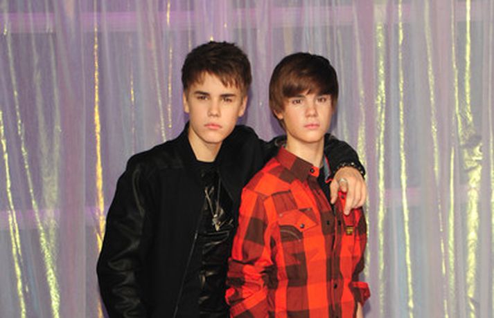 Söngvarinn Justin Bieber, 17 ára, er langt frá því að vera líkur vaxmyndinni af sér, sem var afhjúpuð á Madame Tussauds vaxmyndasafninu í London í gær. Vaxmyndina má skoða í meðfylgjandi myndasafni og þar má einnig sjá mömmu Justin stilla sér upp hjá syni sínum og vaxmyndinni.