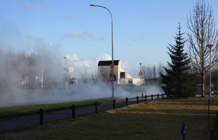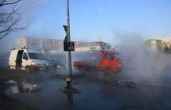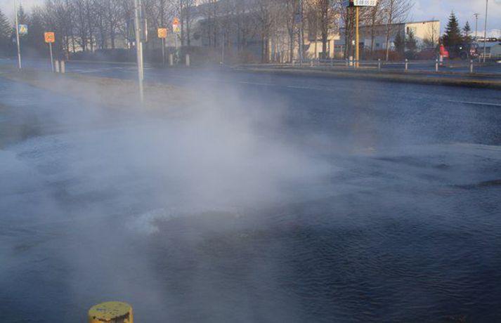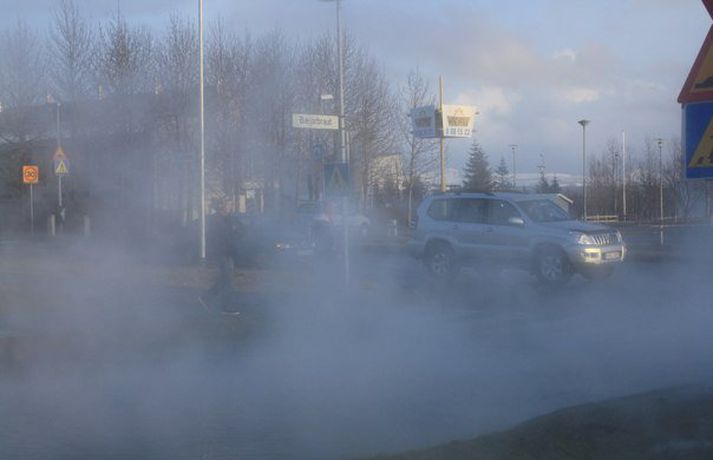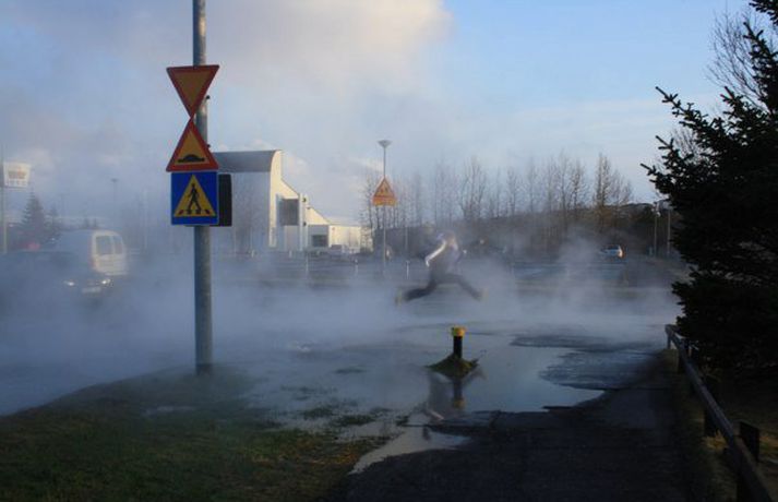Heitt vatn flæddi yfir Rofabæinn - íbúi náði myndum 13. apríl 2011 08:56 Sonur Ólafar Önnu gerði sér leik að því að taka parkour-stökk yfir vatnið en hann var ekki í neinni hættu Mynd:Ólöf Anna Ólafsdóttir „Ég átti í fullu fangi við að bægja frá börnum sem þarna voru að hjóla. Þau voru frekar ráðvillt í þokunni," segir Ólöf Anna Ólafsdóttir, íbúi í Árbæ í Reykjavík, sem var rétt fyrir utan heimili sitt við gatnamót Rofabæjar og Bæjarbrautar þegar um 70 gráðu heitt vatn fór þar að flæða upp úr brunni á götunni. Mikil gufumyndun varð vegna þessa og skyggni slæmt. Eins og greint hefur verið frá varð tjón á mörgum heimilum í vestanverðum Árbænum í gærkvöldi þegar heitt vatn fór að leka þar úr lögnum. Ólöf Anna slapp við vatnsskemmdir á sínu heimili. Hún ætlar þó að sjá til þess að einhver verði heima hjá henni klukkan tíu, eins og Orkuveita Reykjavíkur hefur mælst til, þegar kveikt verður aftur á vatni sem skrúfað var fyrir í gær. Hún var að koma heim um klukkan sjö í gærkvöldi þegar hún varð vatnslekans á götunni vör. Nokkur umferð var á svæðinu en Ólöf Anna einbeitti sér að því að halda ungmennum frá heita vatninu, svo og að taka myndir. Það var síðan um klukkustund síðar sem starfsmenn Orkuveitunnar mættu á staðinn. Tengdar fréttir Tjón á heimilum í Árbæ Heitavatnslagnir innanhús hafa brostið í tengslum við bilunina í vestanverðu Árbæjarhverfinu í kvöld. Enn er heitavatnsvatnslaust um vestanverðan Árbæinn og viðbúið að það standi fram eftir nóttu. 12. apríl 2011 23:44 Heitavatnslaust í Árbæ Heitavatnslaust er í hluta Árbæjarhverfis eftir að aðalæð við Rofabæ bilaði í kvöld. Vatnsleysið nær til þess hluta hverfisins sem er vestan Fylkisvegar, sem liggur frá Rofabæ að Árbæjarlaug. 12. apríl 2011 21:51 Mikið vatnstjón í Árbæjarhverfinu Tjón varð í mörgum íbúðum í vestanverðu Árbæjarhverfinu í Reykjavík í gærkvöldi, þegar heitt vatn fór að leka úr lögnum. 13. apríl 2011 07:03 Mest lesið „Ég hef aldrei upplifað annan eins harm“ Innlent Gaf fingurinn á Miklubraut Innlent Hrindir af stað söfnun fyrir móður stúlkunnar sem lést í Suður-Afríku Innlent Breiddi út faðminn fyrir rasista: „Þið þurfið ekki að biðjast afsökunar á að vera hvít lengur“ Erlent Ný könnun Maskínu: „Væri alveg ný staða í íslenskum stjórnmálum“ Innlent Systir og amma drengs í meðferð létust í Suður-Afríku Innlent Málið sem Trump getur ekki losað sig við Erlent Ætlar ekki að beita sér í máli starfsmanns Útlendingastofnunar Innlent Hundrað og fjörutíu milljarða bótakrafa á Samherja sé súrrealísk Innlent Sextán ára fékk greitt fyrir að færa Epstein stúlkur Erlent Fleiri fréttir Virðist ekki vera hægt á Íslandi Stytting framhjá Blönduósi ekki á samgönguáætlun Vestmannaeyingar fá að eiga Vestmannaeyjar Hyggst kæra dyraverði Auto til lögreglu „Ótrúlega sorglegt að pabbi sé búinn að vera svona lengi í þessari stöðu“ Höfðu samband við dönsku herstjórnina á Grænlandi Ný könnun Maskínu: „Væri alveg ný staða í íslenskum stjórnmálum“ Glæný Maskínukönnun og jólaóveður Ársæll hringdi beint í utanríkisráðherra eftir fundinn Ósannað að fimmtán ára stúlka hafi stungið sextán ára pilt tvisvar Sameina Farice, Öryggisfjarskipti og hluta Neyðarlínunnar Gaf fingurinn á Miklubraut Birtir drög að lögum um lagareldi: Hyggst leggja niður Fiskeldissjóð Hundrað og fjörutíu milljarða bótakrafa á Samherja sé súrrealísk Skemmdir í kirkjugörðum vegna aksturs utan vegar Ólýsanlegur harmur fyrir fjölskylduna og söfnun hleypt af stokkunum „Ég hef aldrei upplifað annan eins harm“ Vill leiða lista Sjálfstæðismanna í Reykjanesbæ „Þetta hefur verið þungur tími“ Naut aðstoðar samskiptasérfræðinga vegna veiðigjaldamálsins Hrindir af stað söfnun fyrir móður stúlkunnar sem lést í Suður-Afríku Varð vitni að ótrúlegum norðurljósum: „Mér fannst þetta magnað“ Færir nýársboðið fram á þrettándann Fjórir fluttir á sjúkrahús eftir bílveltu á Suðurlandi Leggur aftur til hverfislögreglustöð í Breiðholti Nú má heita Love, Tóní, Ranimosk og Draumur Kvartar til umboðsmanns og vonar að Vegagerðin sjái að sér Ætlar ekki að beita sér í máli starfsmanns Útlendingastofnunar „Ég vil ekki nokkurn tímann sjá neitt svona aftur“ Gyðingar á Íslandi upplifa aukinn ótta Sjá meira