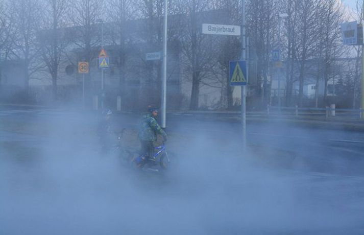 „Ég átti í fullu fangi við að bægja frá börnum sem þarna voru að hjóla. Þau voru frekar ráðvillt í þokunni," segir Ólöf Anna Ólafsdóttir, íbúi í Árbæ í Reykjavík, sem var rétt fyrir utan heimili sitt við gatnamót Rofabæjar og Bæjarbrautar þegar um 70 gráðu heitt vatn fór þar að flæða upp úr brunni á götunni. Mikil gufumyndun varð vegna þessa og skyggni slæmt. Eins og greint hefur verið frá varð tjón á mörgum heimilum í vestanverðum Árbænum í gærkvöldi þegar heitt vatn fór að leka þar úr lögnum. Ólöf Anna slapp við vatnsskemmdir á sínu heimili. Hún ætlar þó að sjá til þess að einhver verði heima hjá henni klukkan tíu, eins og Orkuveita Reykjavíkur hefur mælst til, þegar kveikt verður aftur á vatni sem skrúfað var fyrir í gær. Hún var að koma heim um klukkan sjö í gærkvöldi þegar hún varð vatnslekans á götunni vör. Nokkur umferð var á svæðinu en Ólöf Anna einbeitti sér að því að halda ungmennum frá heita vatninu, svo og að taka myndir. Það var síðan um klukkustund síðar sem starfsmenn Orkuveitunnar mættu á staðinn.