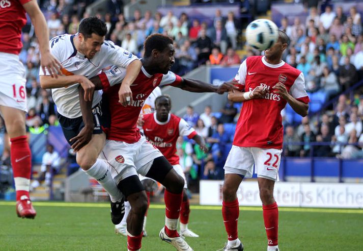 Titilvonir Arsenal litlar eftir tap Eiríkur Stefán Ásgeirsson skrifar 24. apríl 2011 14:52 Nordic Photos / Getty Images Arsenal tapaði í dag fyrir Bolton, 2-1, og á fyrir vikið litla sem enga möguleika á að vinna enska meistaratitilinn nú í vor. Arsenal hefur nú aðeins unnið einn leik í síðustu níu deildarleikjum sínum og aðeins fengið átta stig af 27 mögulegum síðan í byrjun mars. Liðið er nú átta stigum á eftir Manchester United á toppi deildarinnar og því hafa þessi töpuðu stig - nítján talsins - verið liðinu ansi dýrkeypt. Það var Ísraelsmaðurinn Tamir Cohen sem skoraði sigurmark Bolton í uppbótartíma leiksins. Hann skoraði með skalla af stuttu færi. Cohen lyfti þó upp treyju sinni og sýndi bol sem var með mynd af föður hans, Avi Cohen, sem lést í mótorhjólaslysi í lok síðasta árs. Þetta var augljóslega tilfinningarík stund fyrir Cohen og mátti sjá að hann felldi tár. Avi Cohen er vel þekktur í Bretlandi enda lék hann með bæði Liverpool og Rangers á sínum tíma. Liðsfélagar hans fögnuðu markinu hans vel og innilega en þeirra á meðal var Grétar Rafn Steinsson sem lék allan leikinn fyrir Bolton í dag. Daniel Sturridge kom Bolton yfir á 38. mínútu er hann skallaði í netið af stuttu færi. Sturridge fylgdi eftir skalla Gary Cahill sem var varinn á marklínu. Bolton fékk tækifæri til að komast í 2-0 í upphafi síðari hálfleiks er Johan Djourou braut á Sturridge í vítateig Arsenal. Wojicech Szczesny varði þó arfaslaka spyrnu Kevin Davies af vítapunktinum. Aðeins mínútu síðar var Arsenal búið að jafna metin. Cesc Fabregas náði að stilla upp fyrir Robin van Persie sem skoraði með laglegu skoti af vítateigslínunni. Arsenal náði þó ekki að færa sér þennan meðbyr í nyt og tapaði svo leiknum í uppbótartíma, sem fyrr segir. Bolton er í áttunda sæti deildarinnar með 46 stig. Mest lesið Gleði og sorg í sigri Liverpool Enski boltinn Joshua kjálkabraut Paul Sport Gagnrýndi Paul: „Beið eftir að verða sleginn“ Sport Slot fámáll um stöðuna á Isak Enski boltinn Gyökeres skaut Arsenal aftur á toppinn Enski boltinn Ronaldo á nærbuxunum lætur Elon Musk efast um sjálfan sig Fótbolti Salah bað samherjana afsökunar Enski boltinn Rekinn af HM eftir að hafa fallið á lyfjaprófi Sport Lineker fokillur við blaðamann: „Þvílíkt kjaftæði“ Enski boltinn Chelsea vann upp tveggja marka forskot á St James' Park Enski boltinn Fleiri fréttir Calvert-Lewin hættir ekki að skora Gyökeres skaut Arsenal aftur á toppinn Slot fámáll um stöðuna á Isak Gleði og sorg í sigri Liverpool Dramatík er Broja reyndist hetja Burnley Haaland frábær er Manchester City komst á toppinn Andri Lucas skoraði í langþráðum sigri Blackburn Chelsea vann upp tveggja marka forskot á St James' Park Ekkert fararsnið á Guardiola sem segir að City verði að vera undirbúið Tíu bestu mörkin úr leikjum Liverpool og Tottenham Salah bað samherjana afsökunar Lineker fokillur við blaðamann: „Þvílíkt kjaftæði“ Skírði soninn LFC og Mac Allister lét draum feðganna rætast Jóga og pílates lykillinn að snöggri endurkomu Fantasýn: „Hann setti allt á 3 og það kom upp 19“ Alexander Isak fékk sænska gullboltann „Salah líkaði ekki að vera í skugganum af Isak og Wirtz“ Amorim vill Neves Benti á hinn íslenska Dan Burn Lést á leiðinni heim úr fótboltaleik Forsætisráðherrann hótar Roman Abramovich og segir að „klukkan tifi“ „Sýnum kvennaíþróttir af því að þær eru frábærar“ Snéri aftur í fótbolta eftir 35 ára hlé: „Kalla mig Jackie Grealish“ Óttast að besti leikmaður Liverpool verði frá Ungstirnið skallaði meistarana áfram Gat ekki komið í veg fyrir að City færi áfram City sagt ætla að keppa við Liverpool og United um Semenyo Man United ósátt við Marokkó og FIFA Sápan trolluð: „Þetta er þessi klikkhaus með röddina“ Stjarnan fór í dulargervi: Setti stuðningsmann United á óþekka listann Sjá meira