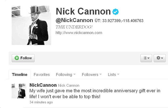 Söngkonan Mariah Carey, 41 árs, og eiginmaður hennar, Nick Cannon, 30 ára, eignuðust tvíbura í dag, dreng og stúlku, á fjögurra ára brúðkaupsafmælinu þeirra, klukkan 12:07, á Los Angeles spítalanum. Eiginkona mín gaf mér ótrúlegustu gjöf sem hægt er að hugsa sér á brúðkaupsafmælisdaginn. Ég á aldrei eftir að toppa hana, skrifaði Nick á Twitter síðuna sína í dag eins og sjá má í myndasafni (skjáskot). Hjónin hafa ekki gefið tvíburunum nöfn en þau hlustuðu saman á vinsælt lag Mariuh We Belong Together strax eftir að börnin fæddust. Hlusta má á lagið þeirra í meðfylgjandi myndskeiði.