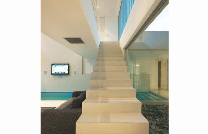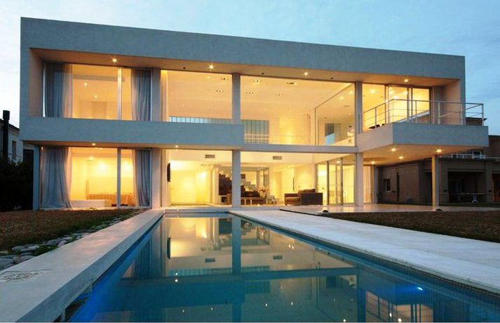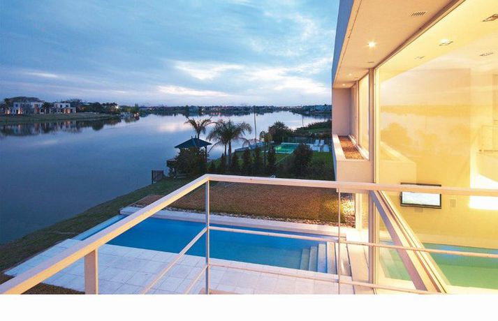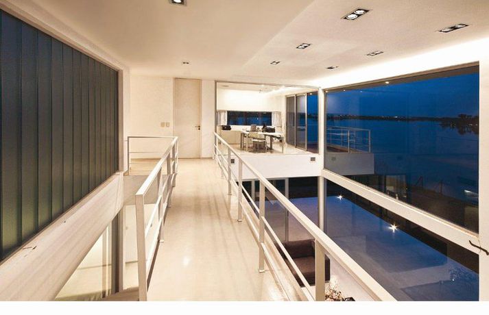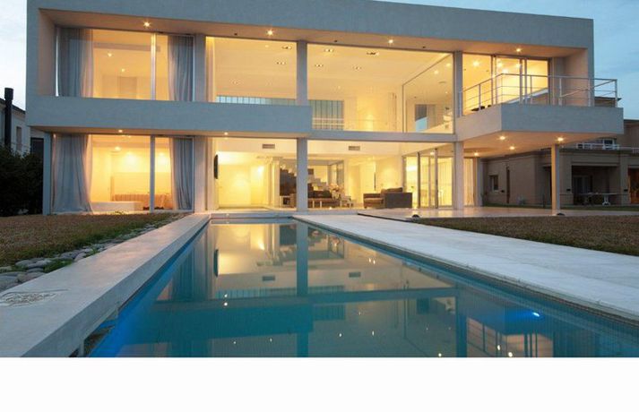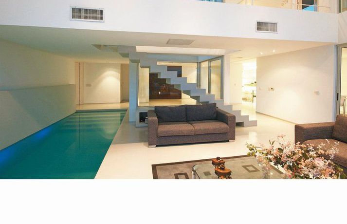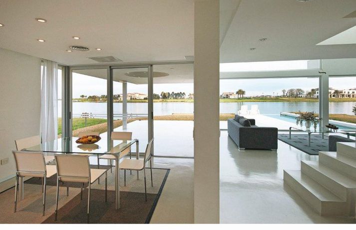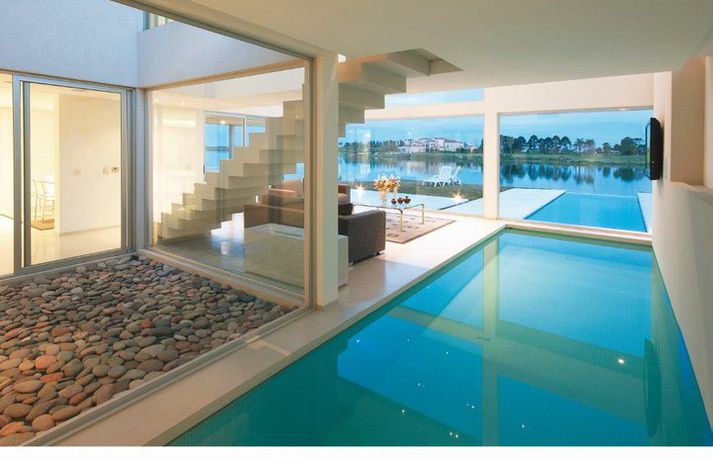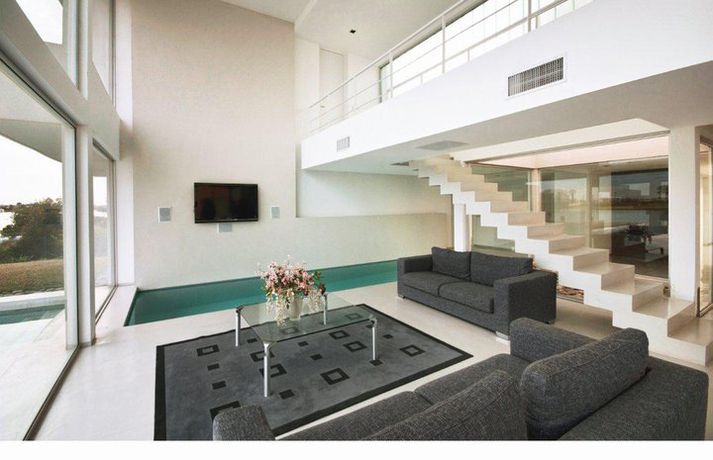 Þó svo að Argentína sé þekkt fyrir djúpa efnahagskreppu og fátækt þá er ljóst að það er engin kreppa hjá heppnum eiganda þessarar nýbyggðu lúxusvillu í Argentínu. Nútímaleg hvít villa með mjög sérstakri sundlaug sem flæðir úr garðinum og inn í húsið. Það er því hægt að stinga sér til sunds beint úr sjónvarpssófanum og synda í gegnum stofuna og út í garð. Athyglisverð hugmynd, eins og sjá má í myndasafni, og örugglega frábær fyrir fólk í þessu heita loftslagi að geta kælt sig með því að rúlla sér úr sjónvarpssófanum í stofunni og beint ofan í ískalda sundlaug. Spurning er svo hvort klórlyktin úr lauginni sé svo endilega sá stofuilmur sem allir myndu vilja kjósa sér.
