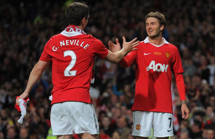 Kveðjuleikur Gary Neville fór fram á Old Trafford, heimavelli Manchester United í kvöld en margir af hans gömlu félögum í United tóku þátt í leiknum. Þeir Gary Neville, Phil Neville, Ryan Giggs, David Beckham, Nicky Butt og Paul Scholes stigu sín fyrstu skref í aðilliði United á svipuðum tíma, í upphafi tíunda áratugs síðustu aldar, og voru aftur saman komnir í kvöld af þessu tilefni. Glöddust sjálfsagt margir að sjá David Beckham aftur í búningi Manchester United en hann fór frá liðinu árið 2003. Var honum fagnað innilega í hvert sinn þegar hann kom við boltann í kvöld. Andstæðingurinn í kvöld var úrvalslið Juventus með Alessandro Del Piero sem fyrirliða. Svo fór að Juventus fagnaði sigri, 2-1, eftir að Wayne Rooney hafði komið United yfir. Rooney fékk að spila í hálftíma, rétt eins og þeir Paul Scholes og Ryan Giggs enda fer úrslitaleikur Meistaradeildarinnar fram um helgina. Þar mun United mæta Barcelona. „Það sem mestu skiptir er að strákarnir meiddust ekki í leiknum,“ sagði Gary Neville eftir leikinn. „Ég naut kvöldsins þó svo að ég hefði gjarnan viljað vinna. En þetta fór svona.“ Simone Pepe og Manuel Giandonato skoruðu mörk Juventus í leiknum. Myndir úr leiknum má sjá hér fyrir neðan.