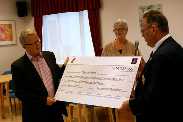 Afhentu Blindrafélaginu rúmar 19 milljónir vegna talgervils 29. júní 2011 21:13 Fulltrúar Lionshreyfingarinnar á Íslandi afhentu fulltrúum Blindrafélagsins í gær afrakstur söfnunarinnar „Rauð fjöður“ sem fór fram 8.-10. apríl. Þá söfnuðust alls rúmlega 19,3 milljónir króna sem runnu óskertar til kaupa á talgervli, með íslensku talmáli, sem verið er að smíða í Póllandi. Talgervillinn mun nýtast blindum, sjónskertum, fólki með lesblindu og öðrum þeim sem eiga erfitt með lesmál. Mest lesið Yfirgefa húsið fyrir fullt og allt á fimmtudag Innlent „Skemmtilegra ef við hefðum lent á hinu árinu“ Innlent Sakar framkvæmdastjóra Landspítala um ósannindi Innlent Stórfelld líkamsárás og aðstoð mistúlkuð sem innbrot Innlent „Við verðum að fá fólk heim aftur“ Innlent Merz segir Írani spila með Bandaríkjastjórn Erlent Hvenær slítur maður viðræðum og hvenær slítur maður þeim ekki? Innlent Inga kemur Ingó til varnar Innlent Ákærður fyrir banatilræði við Trump Erlent Konungshjónin komin vestur um haf og Karl ávarpar þingið í dag Erlent Fleiri fréttir Bein útsending: Húsnæðismál í aðdraganda kosninga Sumarbúðir fatlaðra barna í húsi sem sé úr sér gengið Vongóður um að fundur með Apple skili árangri Hvenær slítur maður viðræðum og hvenær slítur maður þeim ekki? Stórfelld líkamsárás og aðstoð mistúlkuð sem innbrot „Skemmtilegra ef við hefðum lent á hinu árinu“ Sakar framkvæmdastjóra Landspítala um ósannindi Yfirgefa húsið fyrir fullt og allt á fimmtudag „Við verðum að fá fólk heim aftur“ „Komið þá með allt það sem gerðist síðast“ Fyrstu íslensku GPS-heiðlóurnar komnar heim Harmleikurinn á Edition og umdeild bifreiðarstöð Óvenjulegu tímabili að ljúka Jón Pétur segir enga feðraveldisrembu í „árþúsunda náttúruvali“ Heimilt að nota rafrænt eftirlit í nálgunarbannsmálum „Það þarf að taka í handbremsuna strax“ „Var þetta einhver skets?“ Inga kemur Ingó til varnar Íbúar funda aftur um stöðu Kaffistofunnar Konan ákærð fyrir manndráp á Edition Eden Mining vill ekki sjá málið fyrir dómstólum Ísland kunni að kreista veski ríkra ferðamanna Íslendingurinn var nemandi í lýðháskóla „Mér finnst þetta ákaflega dapurleg framganga“ Sjö þúsund störf gætu verið unnin af gervigreind Vill hætta veiðum en græna ljós Bjarna gildi Hitafundur í utanríkismálanefnd og ráðherra boðar breytingar á hvalveiðilögum Inga vill ekki setja „tugi milljarða í loftslagsmál“ Beitir sér ekki sérstaklega fyrir því að spurningunni verði breytt Stjórnarþingmaður segir Hafró í bullandi pólitík Sjá meira