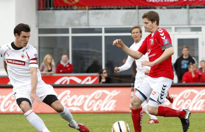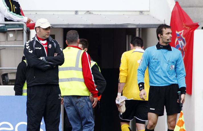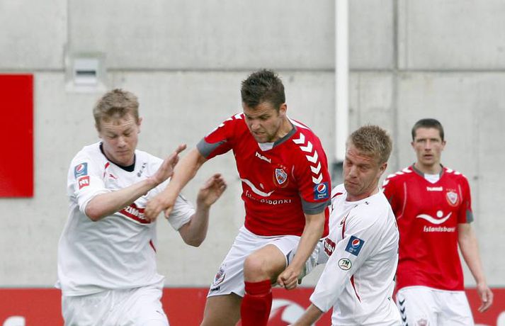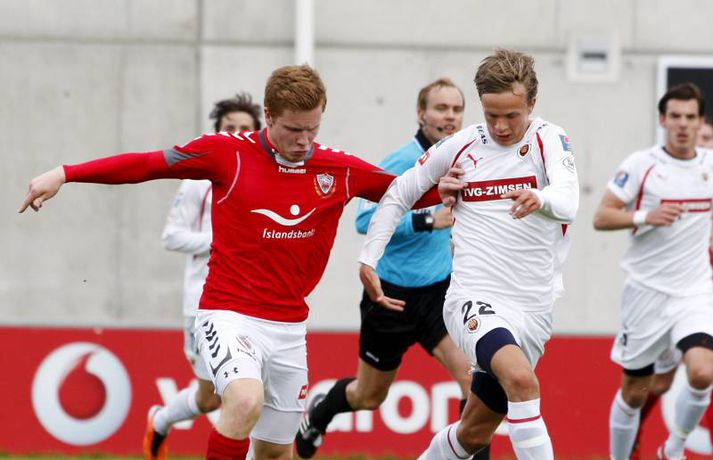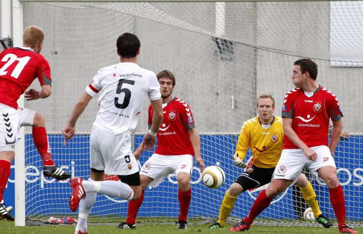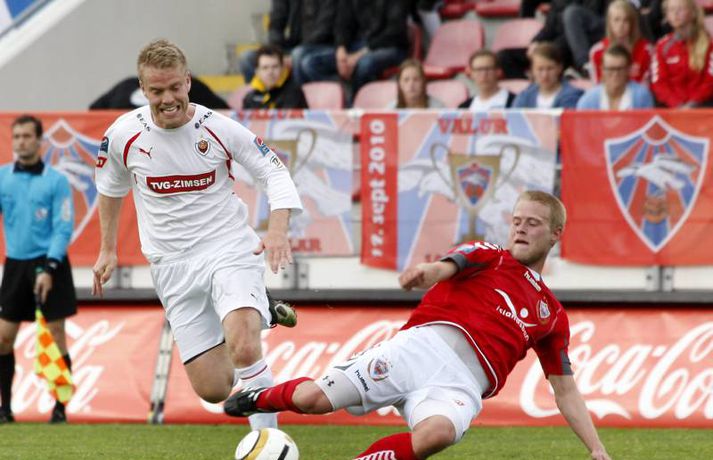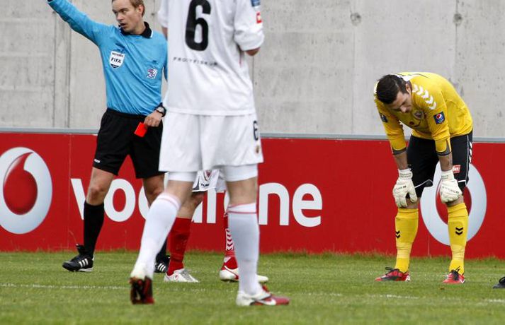 Valur lék manni færri í rúmar 60 mínútur og lenti þar að auki undir gegn Víkingum í gær þegar rúmar tíu mínútur voru til leiksloka. Engu að síður unnur þeir leikinn, 2-1. Haraldur Björnsson, markvörður Vals, fékk að líta rauða spjaldið á 26. mínútu en Víkingum tókst ekki að færa sér liðsmuninn í nyt fyrr en að Marteinn Briem skoraði á 79. mínútu. Guðjón Pétur Lýðsson minnkaði muninn fyrir Val á 85. mínútu en Haukur Páll Sigurðsson tryggði Valsmönnum sigurinn þegar örfáar sekúndur voru til leiksloka. Anton Brink, ljósmyndari Vísis og Fréttablaðsins, var á vellinum og tók þessar myndir.Mynd/Anton