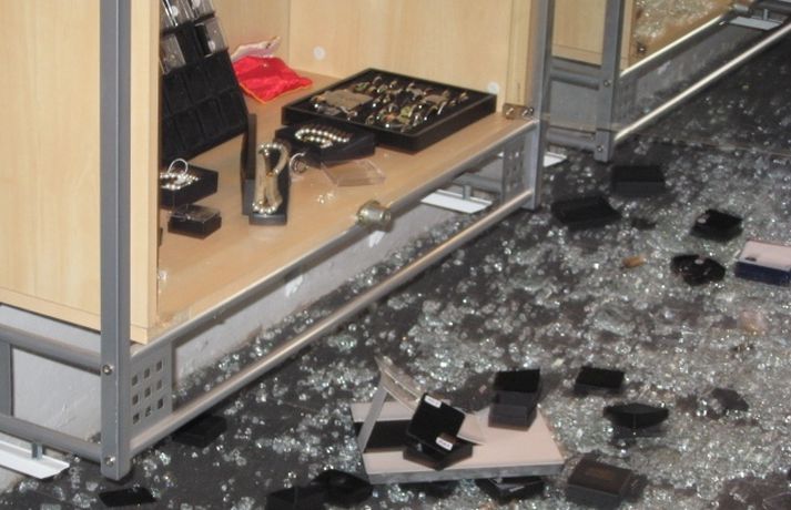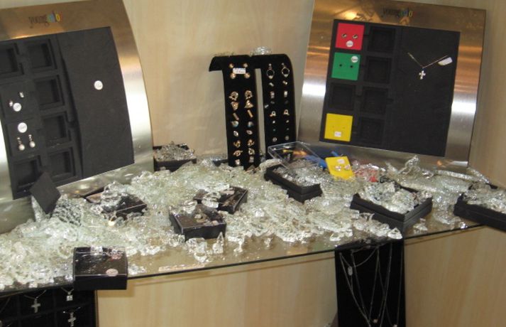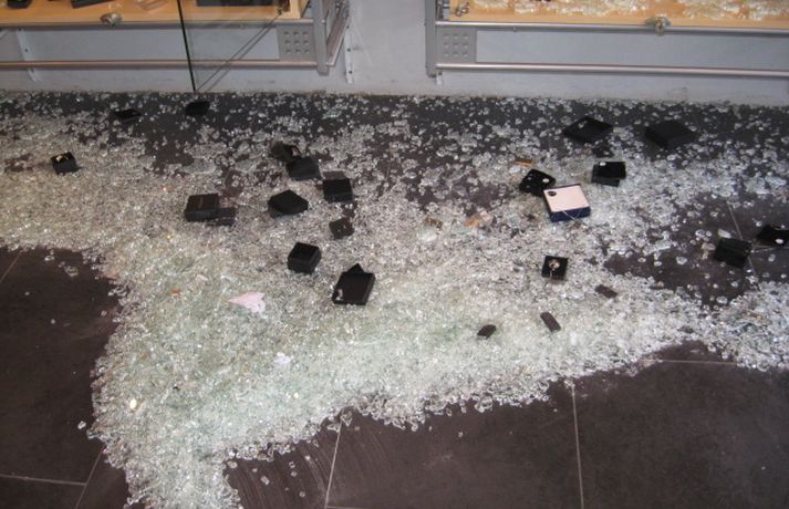 Innbrot í skartgripaverslun: „Þeir réðust á skápana með sleggju“ 22. júní 2011 19:23 Svona var aðkoman þegar Elísabet kom í verslunina klukkan átta í morgun Mynd/Elísabet „Ég kom klukkan átta í morgun og það var eins og handsprengju hefði verið kastað hingað inn, glerbrotin voru eins og snjór yfir öllu," segir Elísabet Elíasdóttir, annar tveggja eigenda skartgripaverslunarinnar Úr og skartgripir - Nonni Gull í Hafnarfirði. Brotist var inn í verslunina í nótt og komust þjófarnir undan áður en lögregla kom á vettvang. Þrátt fyrir að lögregla hafi leitað í nágreninu í nótt bar sú leit ekki árangur og ganga þjófarnir enn lausir. Elísabet segir að þjófarnir hafi verið tveir og þegar þeir voru búnir að brjóta sér leið inn í verslunina hafi þeir gengið beint að verki. „Þeir réðust á skápana með sleggju og brutu þá þannig - það var allt út í glerbrotum hérna," segir Elísabet og tekur fram að þeir hafi aðallega tekið skartgripi úr gulli. „Svo tóku þeir líka sýnishorn af trúlofunarhringjum en þeir eru bara plat," segir hún. Vitni sem sá þjófana í nótt segir að þeir hafi verið í hermannabuxum, dökkum hettupeysum og með klúta bundna fyrir andlitin. Lögreglan fer nú yfir öryggismyndavélar en fjórar slíkar eru í versluninni. „Þeir voru greinilega búnir að kanna búðina. Það komu hér þrír menn í gær og voru voðalega laumulegir og dulafullir. Þeir voru eins og þeir væru með símamyndavélar og töluðu ekkert við mig," segir Elísabet sem vill þó ekki fullyrða að það hafi verið þeir sem brutust inn í verslunina í nótt. Lögreglan rannsakar nú málið en þeir sem hafa upplýsingar um innbrotið eru beðnir um að hafa samband við lögreglu. Mest lesið Setur „stærsta samning í sögunni“ í uppnám Erlent Vilja beita „ofurvopni“ ESB gegn Bandaríkjunum Erlent Karólína Helga skákaði sitjandi oddvita í Hafnarfirði Innlent Hundruð hermanna í viðbragðsstöðu vegna Minnesota Erlent Önnur stúlka með móður sinni þegar Högni var klófestur Innlent Líkir kærunni við „faglega aftöku“ Innlent Myndir: Þúsundir mótmæltu á Grænlandi Erlent Stöðugleikasamningarnir gætu sprungið strax í haust Innlent Dæmi um að nemendur hafi aldrei mætt í leikfimi Innlent Sambandið aldrei verra: Ísland gæti bæst á listann Innlent Fleiri fréttir Haldið upp á 80 ára afmæli Hveragerðis allt afmælisárið Sambandið aldrei verra: Ísland gæti bæst á listann Dæmi um að nemendur hafi aldrei mætt í leikfimi Grænlandstollar vonbrigði og verðbólga spillir kjarasamningum Stöðugleikasamningarnir gætu sprungið strax í haust Heimsmálin, Grænland, menntun og fjölmiðlun á Sprengisandi Karólína Helga skákaði sitjandi oddvita í Hafnarfirði Ísland standi með Grænlandi og Danmörku Vonar að skólarnir verði frjálsir frá símum í haust Álagning aldrei hærri: Eldsneytisverð hefði átt að lækka enn frekar Líkir kærunni við „faglega aftöku“ „Vegferð ákæruvaldsins til skammar“ Menntamálaráðherra tekur yfir hjúkrunarheimilin Fjögur handtekin á Akureyri grunuð um innbrot Viðvarandi óvissuástand bitni á langtímaáætlunum fyrirtækja Einn endaði á hliðinni og þrjú klemmdust á milli Var í símanum við neyðarlínuna þegar ekið var aftan á hann Ákvörðunin á ábyrgð stjórnenda Icelandair en ekki flugmanna „Hef hvergi hallað réttu máli“ Önnur stúlka með móður sinni þegar Högni var klófestur Fá þau að vera aftur á lista með Hildi? Fimm bíla árekstur á Reykjanesbraut og tveir fluttir á slysadeild Eigum eftir að sjá hvort Guðbrandur bæti upp fyrir hegðun sína Umfangsmikil lögregluaðgerð við Glerárgötu á Akureyri Öryrkjar eru með hærri laun en eldri borgarar Borgarstjóri fór með rangt mál Gagnrýnin hugsun skipti máli Krafa um að Margrét Löf verði gerð arflaus fer fyrir Landsrétt Hófu niðurrif á félagsheimilinu í leyfisleysi: „Skaðinn er skeður“ Fjórir slást um oddvitasæti Viðreisnar Sjá meira