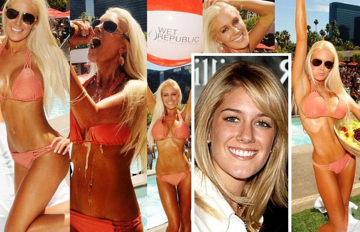 Meðfylgjandi má sjá bandarísku raunveruleikastjörnuna Heidi Montag sem komst í heimsfréttirnar þegar hún lét gera tíu fegrunaraðgerðir á sér í einu pósa léttklædd og þamba kampavín af stút eins og enginn væri morgundagurinn í sundlaugarpartý í Las Vegas um helgina. Heidi, sem varð þekkt andlit eftir þátttöku sína í þáttunum The Hills lét hafa eftir sér að henni þætti miður að hafa farið í allar þessar lýtaaðgerðir og vildi í framtíðinni nýta reynslu sína til að vara ungar stúlkur við að leggjast undir hnífinn. Í myndaalbúminu má sjá Heidi flippa fyrir nærstadda ljósmyndara sem og gamlar myndir af henni áður en hún leyfði lýtalæknum að krukka í sér.MYNDIR/Cover Media