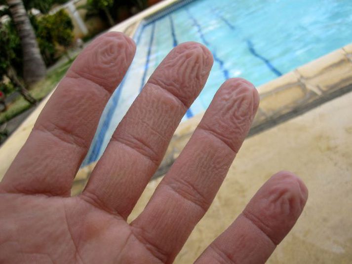 Þess vegna færðu rúsínufingur 5. júlí 2011 20:30 Allir kannast við það að eftir nokkra setu í heita pottinum fara fingur manns að krumpast og líkjast rúsínum. Bandaríska vísindaritið Nature hefur nú eftir sérfræðingi í taugalíffræði að fyrirbrigðið sé engin tilviljun heldur hafi það þróast í gegnum árþúsundin og hafi ákveðnu hlutverki að gegna. Kenning Mark Changizi gengur þvert gegn eldri kenningum sem eru á þá leið að rúsinufingur myndist vegna þess að líkaminn dragi í sig vatn. Changizi telur hinsvegar að tilgangurinn sé annar, nefnilega sá að gefa okkur betra grip með puttunum við blautar aðstæður. Þannig virki hrukkurnar eins og mynstur á bíldekkjum og nái betra gripi á sleipu yfirborði. Sérfræðingar eru þó ekki á einu máli um kenningar Changizi og XI Chen við Columbia háskóla heldur því fram að ástæðan fyrir hrukkunum sé einfaldlega sú að þegar fingurnir liggi í heitu vatni þá dragist æðarnar saman og þá krumpist skinnið. Aðrir eru sammála Changizi og benda á að tilgáta Chen útskýri ekki hversvegna puttarnir krumpist í köldu vatni. Auk myndast hrukkurnar aðeins á fingrum og tám, en ekki um allan líkaman. Mest lesið Trump sýndi verkamanni puttann Erlent Vongóð um stuðning Miðflokksins Innlent Spyr hvort það hafi borgað sig að koma Flokki fólksins til valda Innlent Notað á Íslandi þrátt fyrir að hafa mistekist annars staðar Innlent Keyptu tæki sem gæti útskýrt Havana-heilkennið Erlent Kannast ekki við lýsingar leigubílstjóra Innlent Trump heitir íhlutun ef stjórnvöld hefja aftökur Erlent Fundurinn í Washington gæti reynst örlagaríkur Erlent Borgin beri ábyrgð sem eigandi Innlent Fellur frá máli sínu á hendur Hödd Innlent Fleiri fréttir Trump heitir íhlutun ef stjórnvöld hefja aftökur Trump sýndi verkamanni puttann Keyptu tæki sem gæti útskýrt Havana-heilkennið Fundurinn í Washington gæti reynst örlagaríkur „Við veljum Danmörku“ Að minnsta kosti þrjú þúsund látnir í Íran Búa sig undir áhlaup um borð í skuggaskip Fá Andrés Önd til að bjarga læsi barna Borgin ber enga ábyrgð í Gufunesbruna og stjórnarmaður í Truenorth segir tjónið óbætanlegt Vance ætlar að sitja fundinn með Løkke og Rubio Farið yfir skandalinn í Minnesota: Vopnvæðir fjársvik til að refsa „bláum ríkjum“ Hótar Musk frekari sektum bregðist hann ekki við barnaníði Lögðu hald á tíu tonn af kókaíni nærri Kanaríeyjum Kynnir sér möguleika varðandi Íran og leggur toll á vinaríki klerkastjórnarinnar Machado heimsækir Hvíta húsið á fimmtudag Vara Evrópuríkin við því að taka á móti embættismönnum frá Taívan Þvert nei Grænlendinga við yfirtöku Bandaríkjanna Trump ósáttur við orð olíuforstjórans og vill útiloka hann Bretar ætla að framleiða skotflaugar fyrir Úkraínu Hefja formlega rannsókn á kynferðislegum fölsunum Musk Stuðningsmenn klerkastjórnarinnar fjölmenna á götum Tehran Hafa lokað yfir hálfri milljón samfélagsmiðlaaðganga Rannsaka nú og skoða ákærur gegn seðlabankastjóranum Trump íhugar íhlutun í Íran Danir standi á krossgötum Segir Kúbu að semja áður en það verður of seint Páfi hefur áhyggjur af tjáningarfrelsi á Vesturlöndum Bandaríkin og Ísrael verði skotmörk verði ráðist að Íran Spítalar yfirfullir af látnum mótmælendum Bandaríkin gerðu loftárásir gegn ISIS í Sýrlandi Sjá meira