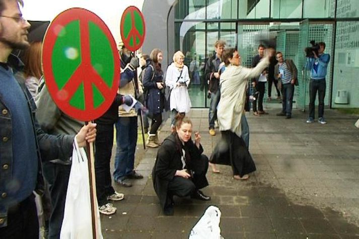 Friðarsinnar köstuðu skóm - skíðaskór voru bannaðir 1. júlí 2011 14:24 Friðarsinnar fjölmenntu við Öskju, náttúrufræðihús Háskóla Íslands, í dag og köstuðu skóm til að lýsa yfir andúð sinni á varaframkvæmdastjóra Nató, Claudio Bisogniero, sem hélt þar erindi í hádeginu. Samtök hernaðarandstæðina leituðu þarna í hugmyndasmiðju blaðamannsins Muntazer al-Zaidi frá Írak sem vakti athygli fyrir nokkrum misserum þegar hann sýndi andúð sína á hernámi Bandaríkjamanna með því að kasta skóm sínum í átt að George W. Bush forseta. „SHA vilja þó árétta að samtökin eru ekki hlynnt því að skóm sé kastað í fólk og dýr. Þess vegna verður komið upp sérstökum skókastbökkum fyrir utan Öskju. Brúklegir kastskór verða á staðnum, þótt gestum sé vitaskuld heimilt að koma með sína eigin skó. (Skíðaskór, tréklossar og skór með stáltá bannaðir.)," sagði í hvatningu samtakanna fyrir mótmælin. Að mati Samtaka hernaðarandstæðinga er Nató „árásargjarnt hernaðarbandalag sem hefur þann tilgang að tryggja hagsmuni nokkurra af ríkustu og voldugustu þjóðum heims og ber ábyrgð á miklum hörmungum víða um lönd." Mest lesið Setur „stærsta samning í sögunni“ í uppnám Erlent Karólína Helga skákaði sitjandi oddvita í Hafnarfirði Innlent Önnur stúlka með móður sinni þegar Högni var klófestur Innlent Líkir kærunni við „faglega aftöku“ Innlent Evrópuleiðtogar bregðast við: „Við látum ekki fjárkúga okkur“ Erlent Ekki útilokað að Ísland sæti Grænlandstollum Erlent „Í mínum huga eru þetta klárar ærumeiðingar“ Innlent Ísland standi með Grænlandi og Danmörku Innlent Einn endaði á hliðinni og þrjú klemmdust á milli Innlent Var í símanum við neyðarlínuna þegar ekið var aftan á hann Innlent Fleiri fréttir Karólína Helga skákaði sitjandi oddvita í Hafnarfirði Ísland standi með Grænlandi og Danmörku Vonar að skólarnir verði frjálsir frá símum í haust Álagning aldrei hærri: Eldsneytisverð hefði átt að lækka enn frekar Líkir kærunni við „faglega aftöku“ „Vegferð ákæruvaldsins til skammar“ Menntamálaráðherra tekur yfir hjúkrunarheimilin Fjögur handtekin á Akureyri grunuð um innbrot Viðvarandi óvissuástand bitni á langtímaáætlunum fyrirtækja Einn endaði á hliðinni og þrjú klemmdust á milli Var í símanum við neyðarlínuna þegar ekið var aftan á hann Ákvörðunin á ábyrgð stjórnenda Icelandair en ekki flugmanna „Hef hvergi hallað réttu máli“ Önnur stúlka með móður sinni þegar Högni var klófestur Fá þau að vera aftur á lista með Hildi? Fimm bíla árekstur á Reykjanesbraut og tveir fluttir á slysadeild Eigum eftir að sjá hvort Guðbrandur bæti upp fyrir hegðun sína Umfangsmikil lögregluaðgerð við Glerárgötu á Akureyri Öryrkjar eru með hærri laun en eldri borgarar Borgarstjóri fór með rangt mál Gagnrýnin hugsun skipti máli Krafa um að Margrét Löf verði gerð arflaus fer fyrir Landsrétt Hófu niðurrif á félagsheimilinu í leyfisleysi: „Skaðinn er skeður“ Fjórir slást um oddvitasæti Viðreisnar Afsögn þingmanns, hótanir Trumps og í beinni frá Svíþjóð Mun hærri dánartíðni og meiri örorka hjá fyrrum vöggustofubörnum „Í mínum huga eru þetta klárar ærumeiðingar“ Vilja Laugardalshöll líkt og þeim var lofað Kviknaði í Svarta sauðnum í Þorlákshöfn Taldi ekki sérstaka nauðsyn á að hneppa Helga Bjart í varðhald Sjá meira