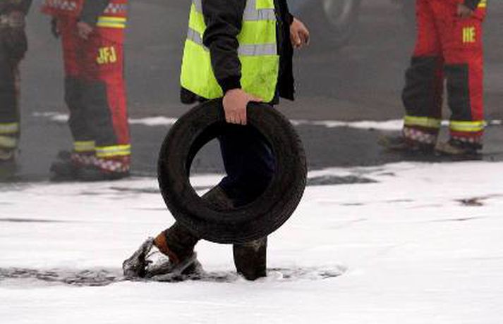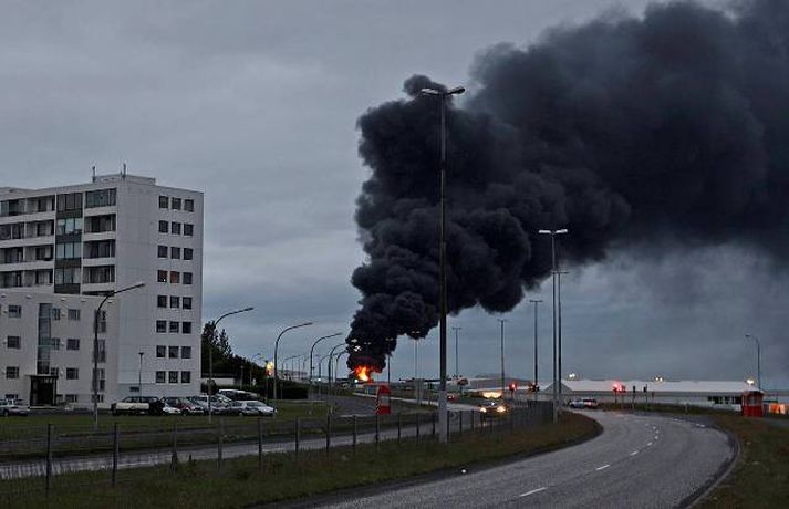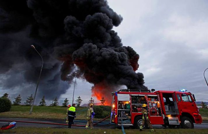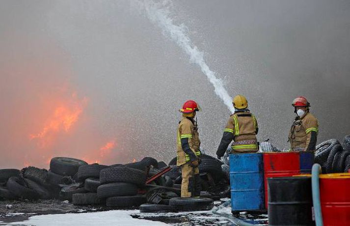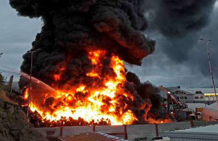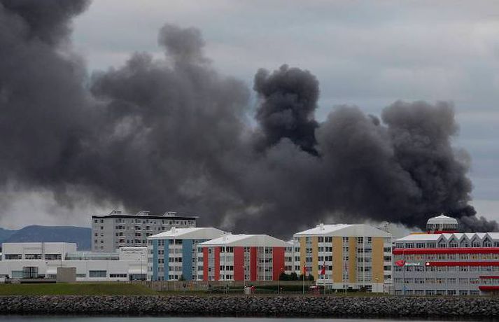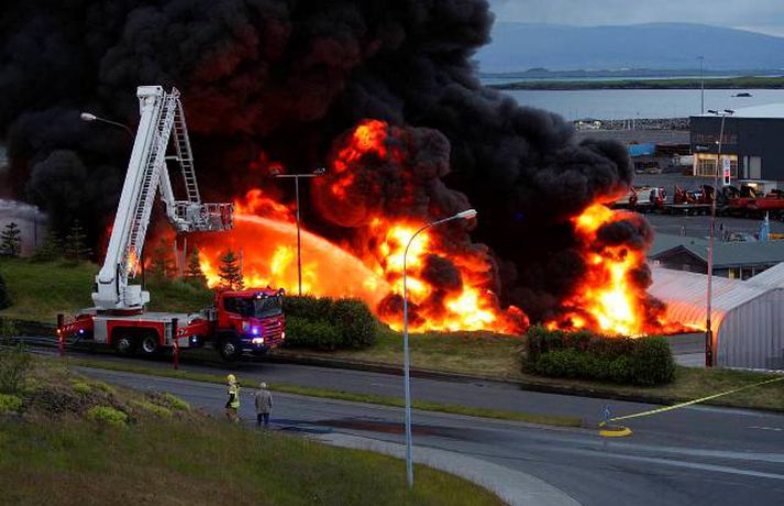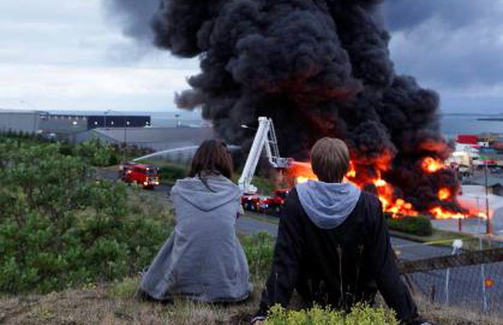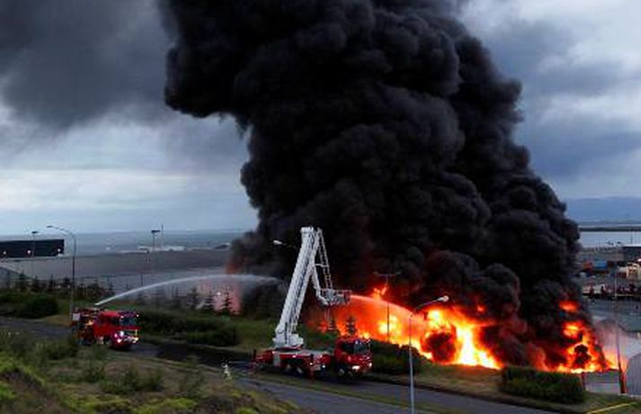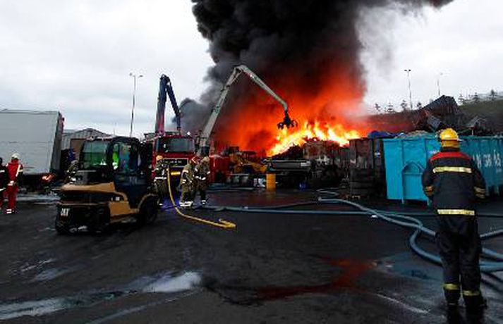 Mikill eldur gaus upp í stórri dekkjastæðu á athafnasvæði Hringrásar við Sundahöfn á þriðja tímanum i nótt og var allt slökkvilið á höfuðborgarsvæðinu kallað út auk manna á frívakt. Gríðar mikinn og svartan reyk lagði frá eldinum, en svo vel vildi til að vindur var suðaustlægur í nótt og lagði reykinn á haf út, en ekki yfir byggðina eins og gerðist í samskonar bruna á sama stað árið 2004. Þá þurftu á sjötta hundrað manns að yfirgefa heimili sín. Starfsmenn fréttastofu stóðu vaktina í nótt og í morgun og í meðfylgjandi myndaalbúmi má sjá myndir sem Vilhelm Gunnarsson, ljósmyndari Fréttablaðsins og Vísis, tók.Ekki þurfti að rýma hús Samhæfingastöð almannavarna í Skógarhlíð var mönnuð í nótt vegna brunans, en vegna hagstæðrar vindáttar var ekki almannavarnaástandi lýst yfir og ekki þurfti að rýma nein hús. Íbúar á Kleppsvegi hafa verið hvattir til að halda gluggum lokuðum þó svo að reyk leggi ekki yfir hverfið þar sem lyktarmengun er talsverð. Haft var samband við forráðamenn fyrirtækja á iðnaðarsvæðinu við Klettagarða og nágrenni og þeir hvattirtil að loka fyrir loftræstingu. 60 manna lið slökkviliðsins sprautaði mikilli kvoðu á eldinn og undir morgun kom slökkviliðsbíll frá Reykjavíkurflugvelli með viðbótar kvoðu, en slökkvibíll frá Keflavíkurflugvelli var sendur á Reykjavíkruflugvöll á meðan. Búið er að slökkva eldinn en búist er við að slökkviliðsmenn verði langt fram eftir morgni að drepa endanlega í glæðum.Minni eldsmatur en í brunanum 2004 Jón Viðar Matthíasson, slökkviliðsstjóri, segir í samtali við Vísi að aðalástæða þess að mun betur gekk nú en fyrir fimm árum sé að eldsmatur hafi verið mun minni núna en var þá. Einnig sé búið að gera breytingar á svæðinu. Búið sé að steypa upp skilveggi á milli þeirra efna sem geymd séu á svæðinu. Engan slökkviliðsmann sakað í aðgerðunum. Eldsupptök eru með öllu ókunn, en rannsókn getur ekki hafist af fullum krafti fyrr en að slökkvistarfi loknu.