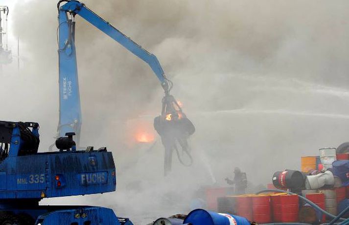 Eldurinn hefur minnkað Slökkviliðsmenn virðast hafa náð tökum á eldinum. Hann er miklu minni en hann var fyrr í morgun, segir Vilhelm Gunnarsson ljósmyndari Fréttablaðsins sem stendur vaktina við Hringrás í Sundahöfn. 12. júlí 2011 05:19