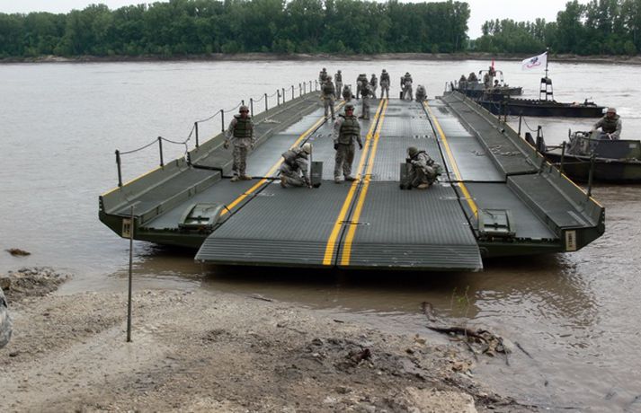 Þannig brúa herir stórfljót á 12 mínútum 10. júlí 2011 16:18 Hermönnum í bandaríska þjóðvarðliðinu tókst á heræfingu fyrir tveimur árum að brúa Missouri-ána, eitt af stórfljótum Bandaríkjanna, á aðeins 12 mínútum og einni sekúndu. Það var gert með því að nota færanlega og fljótandi brú, sem sett var saman úr mörgum einingum. Nánar má lesa um þetta hér. Verkefni verkfræðideilda herja flestra þjóða er að brúa fljót á sem skemmstum tíma. Til þess nota þeir færanlegar brýr og brúarhluta af ýmsum toga, svo sem brýr sem eru ofan á skriðdrekum og brýr ofan á trukkum. Hægt er að flytja þær heimsálfa á milli á skömmum tíma með stórum herflutningavélum, eins og hinni bandarísku Lockheed Calaxy C-5. Því má því spyrja hvort íslenskur ráðherra gætu ekki með einu símtali í kvöld til ráðamanna einhverrar vinaþjóðar í NATO leyst vandann á Mýrdalssandi. Viðbragðsfljót herdeild gæti jafnvel verið komin með brúna til landsins í fyrramálið og hún kannski komin í notkun fyrir næsta kvöld. Hér að ofan má sjá myndir af brúm sem kæmu til greina. Mest lesið Íslendingurinn var nemandi í lýðháskóla Innlent Furðar sig á þögn yfir „einu helsta áhyggjuefni Íslands“ Innlent Maðurinn fannst látinn í gilinu Innlent Ísland kunni að kreista veski ríkra ferðamanna Innlent Inga vill ekki setja „tugi milljarða í loftslagsmál“ Innlent „Við búum í brjáluðum heimi“ Erlent Barist gegn lúsmýinu: „Einhvers staðar eru þær að fjölga sér“ Innlent Konan ákærð fyrir manndráp á Edition Innlent Handteknu hafa komið áður við sögu hjá lögreglu Innlent Inga kemur Ingó til varnar Innlent Fleiri fréttir Jón Pétur segir enga feðraveldisrembu í „árþúsunda náttúruvali“ Heimilt að nota rafrænt eftirlit í nálgunarbannsmálum „Það þarf að taka í handbremsuna strax“ „Var þetta einhver skets?“ Inga kemur Ingó til varnar Íbúar funda aftur um stöðu Kaffistofunnar Konan ákærð fyrir manndráp á Edition Eden Mining vill ekki sjá málið fyrir dómstólum Ísland kunni að kreista veski ríkra ferðamanna Íslendingurinn var nemandi í lýðháskóla „Mér finnst þetta ákaflega dapurleg framganga“ Sjö þúsund störf gætu verið unnin af gervigreind Vill hætta veiðum en græna ljós Bjarna gildi Hitafundur í utanríkismálanefnd og ráðherra boðar breytingar á hvalveiðilögum Inga vill ekki setja „tugi milljarða í loftslagsmál“ Beitir sér ekki sérstaklega fyrir því að spurningunni verði breytt Stjórnarþingmaður segir Hafró í bullandi pólitík Handteknu hafa komið áður við sögu hjá lögreglu Bein útsending: Kristrún svarar spurningum um þjóðaratkvæðagreiðslu Tveir handteknir í tengslum við stórfellda líkamsárás Furðar sig á þögn yfir „einu helsta áhyggjuefni Íslands“ Krónu kastað fyrir aurinn í fjármögnun skóla Maðurinn fannst látinn í gilinu Sást til einstaklings ofan í gili við Háafoss Skrítið að dómsmálaráðherra blandi sér í umræðuna Barist gegn lúsmýinu: „Einhvers staðar eru þær að fjölga sér“ Fallhlífin byrjaði að snúast eftir opnun Stál í stál og sammála um fátt á fundi um ESB Muni vitanlega gera kröfu um sæti í meirihluta Segir Miðflokkinn selja snákaolíu Sjá meira