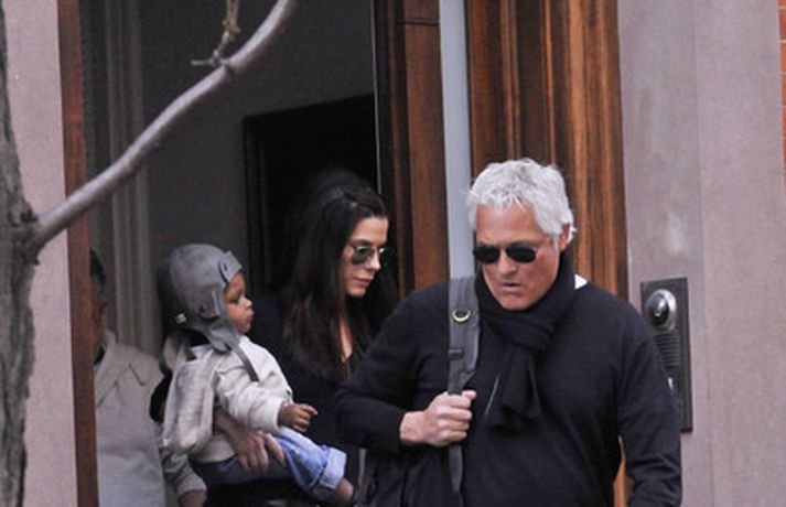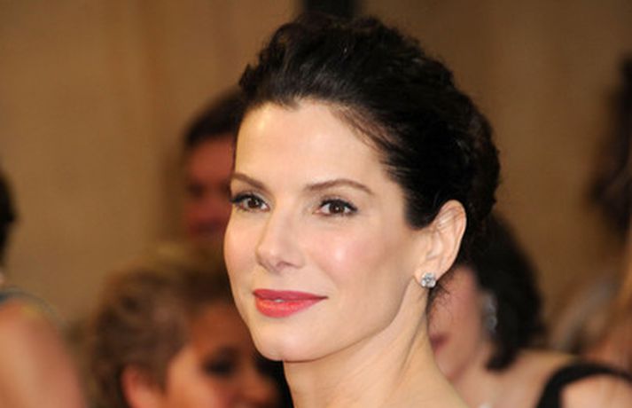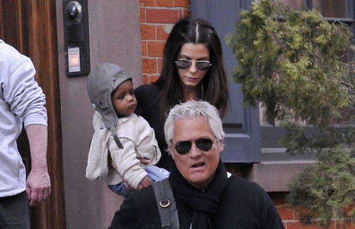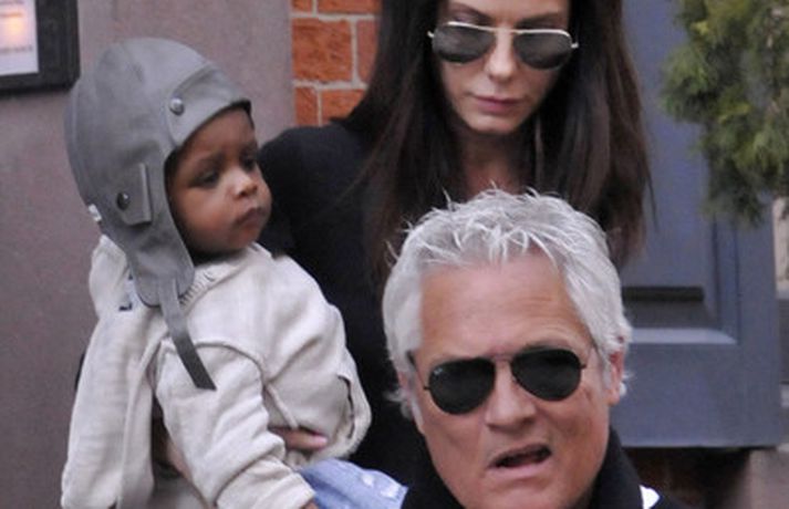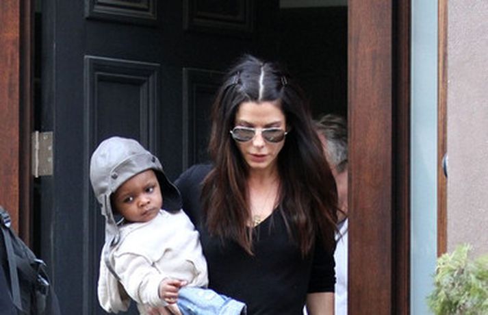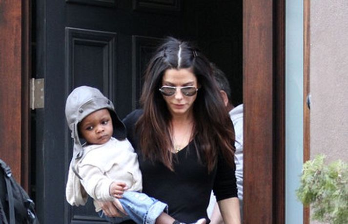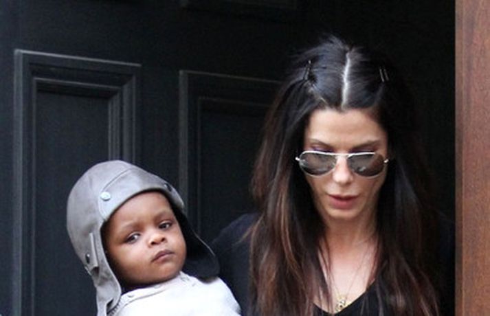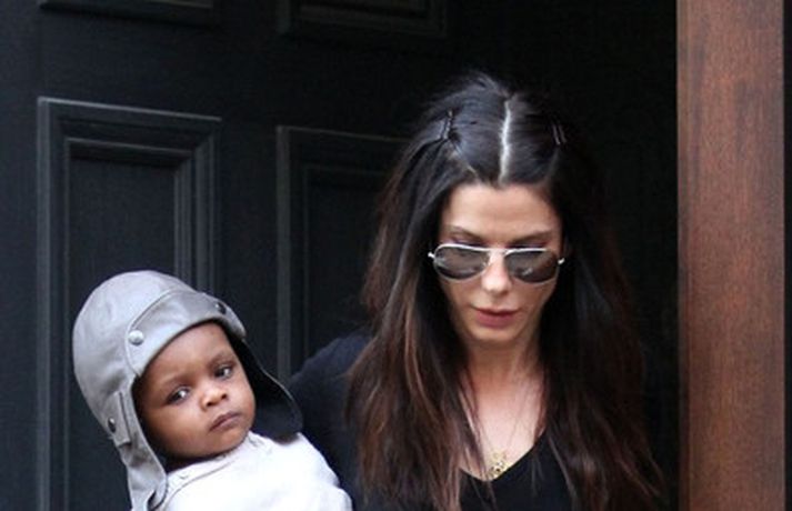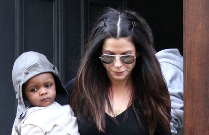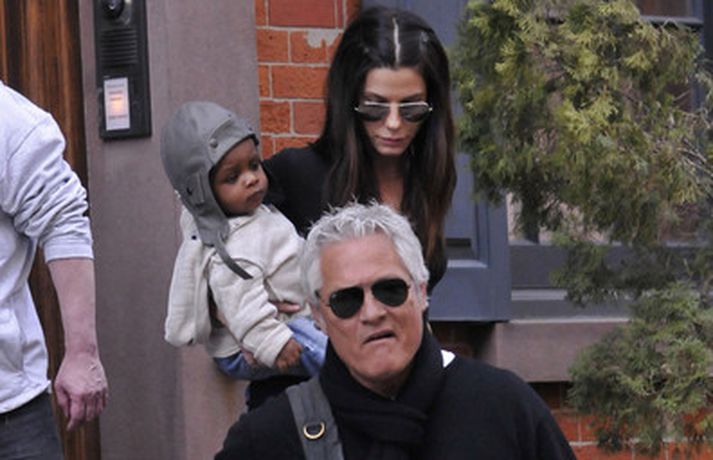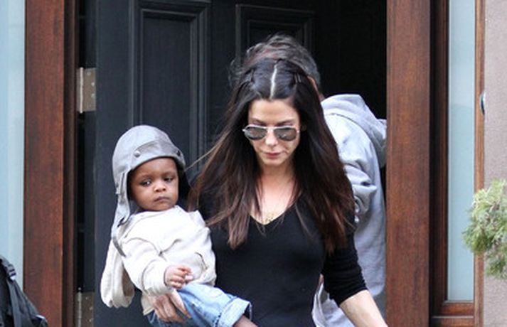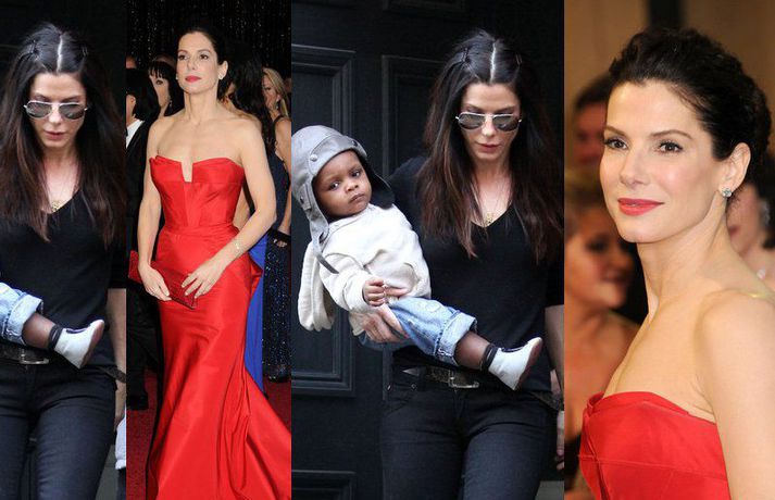 Leikkonan Sandra Bullock, 46 ára, og sonur hennar, Louis Bardo, eins og hálfs árs gamall, voru mynduð yfirgefa heimili þeirra í New York. Þá má sjá Söndru klædda í rauðan síðkjól með uppsett hárið í myndasafni. Leikkonan lúkkar ekki síður vel í gallabuxunum en galakjól eins og greinilega má sjá á myndunum.