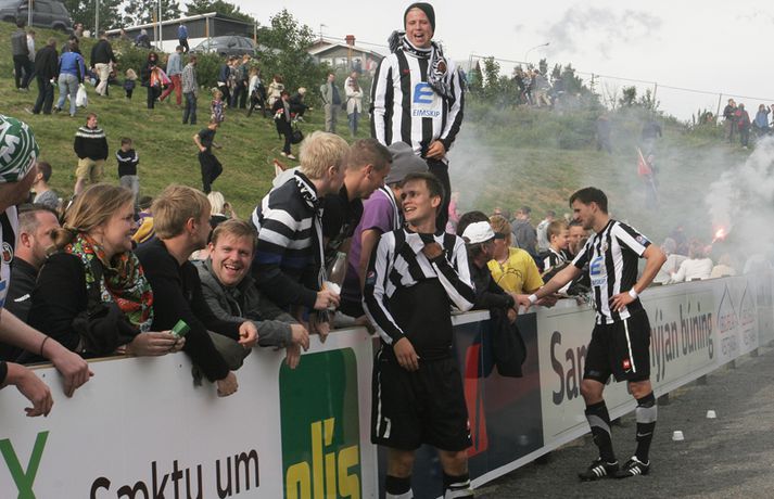 Um miðjan dag í gær kom fjöldi fólks saman komin við Torfnesvöll á Ísafirði vegna undanúrslitaleiks BÍ/Bolungarvík og KR. Löngu áður en leikurinn hófst skapaðist mikil stemmning í og við völlinn. Þangað mættu stuðningsmenn á öllum aldri eins og sést í meðfylgjandi myndasafni. Stuðningsmenn KR fjölmenntu til Ísafjarðar og sett sinn svip á bæinn. Rósa Jóhannsdóttir, ljósmyndari Fréttablaðsins og Vísis, var á staðnum og myndaði stemmninguna fyrir og eftir leikinn sem og auðvitað á meðan á honum stóð. Leiknum lauk með 4-1 sigri KR-inga en staðan í hálfleik var 1-1.