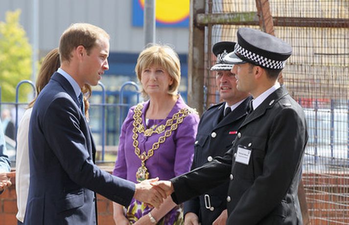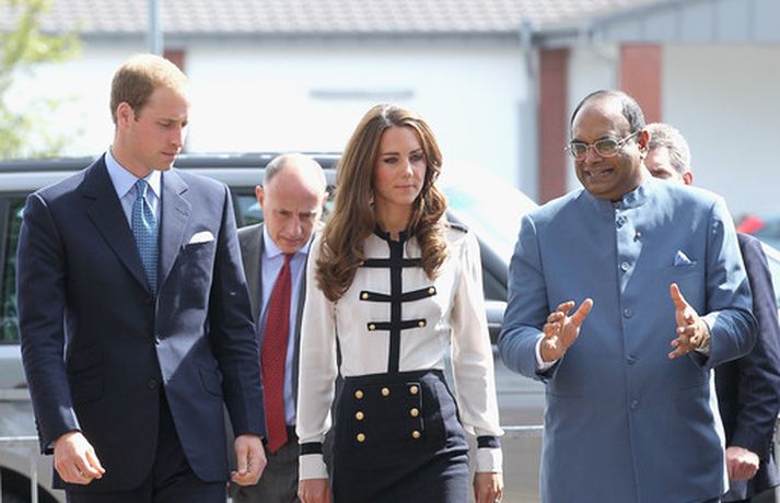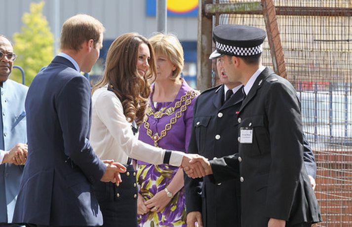 Vilhjálmur Bretaprins og eiginkona hans, hertogaynjan af Cambridge, Kate Middleton, voru mynduð saman í Birmingham í England í dag. Eins og sjá má á myndunum er prinsessan stórglæsileg í dökkbláu pilsi með slegið hárið. Það fer hinsvegar ekki fram hjá nokkrum einasta manni hvað hún hefur horast mikið á örskömmum tíma.Sjá myndirnar hér.Hér má skoða brúðarkjólinn hennar.
