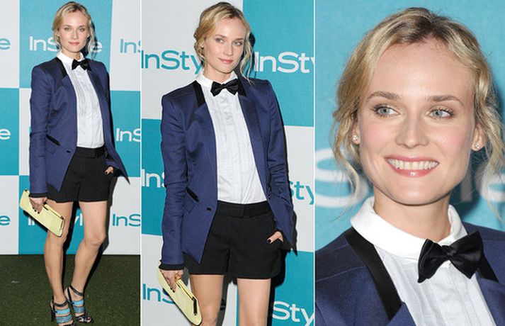 Leikkonan Diane Kruger var klædd í Jason Wu fatnað frá toppi til táar á rauða dreglinum í vikunni eins og sjá má hér. Blár retró jakkinn við stuttar buxurnar, skyrtan og upptekið hárið hefur fengið verðskuldaða athygli í tískudálkum vestan hafs. Takið eftir gula veskinu sem toppar heildina á skemmtilegan máta.Haustlína Jason Wu 2011 (myndir).