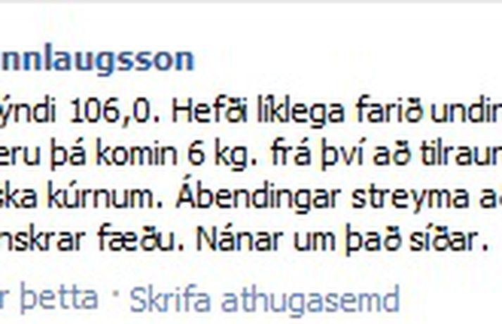 Sigmundur Davíð Gunnlaugsson, formaður Framsóknarflokksins og þingmaður, hefur misst tvö kíló frá því hann byrjaði í megrun fyrir um viku síðan. Þegar átakið hófst var hann 108 kíló en er nú 106 kíló. Sigmundur Davíð byrjaði á megrunarkúr í síðustu viku en hann felst í því að borða einungis íslenskan mat. Hann sagði á heimasíðu sinni fyrir viku síðan að hann myndi birta þyngdarmælingu á mánudögum næsta mánuðinn. Engin færsla kom þó inn á heimasíðuna í gær Á Facebook-síðu hans fannst svo stöðuuppfærsla frá því í gærmorgun en þar segir hann frá því að tvö kíló séu fokin. „Hefði líklega farið undir 106 ef ég hefði verið búinn að raka mig. Það eru þá komin 6 kg. frá því að tilraunir hófust og 2 frá því ég byrjaði á íslenska kúrnum,“ sagði Sigmundur á samskiptavefnum. Jafnframt tekur hann fram að ábendingar streyma að og hann sé enn að uppgötva nýja kosti íslenskrar fæðu. Og skilur svo Facebook-vini sína eftir með orðunum: „Nánar um það síðar.“