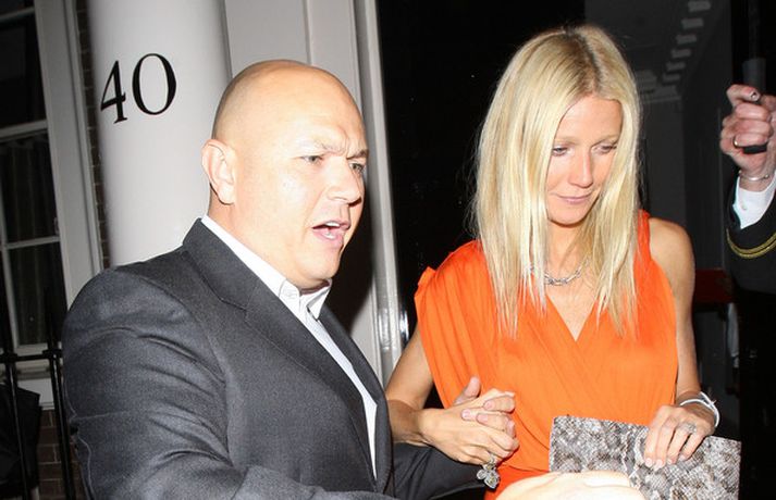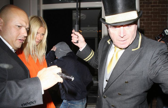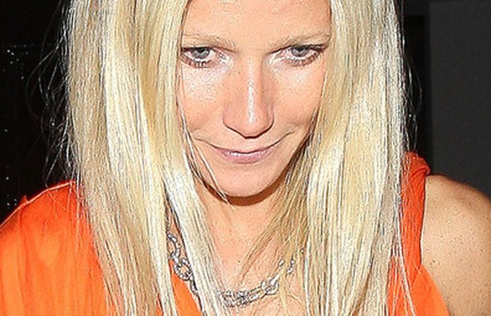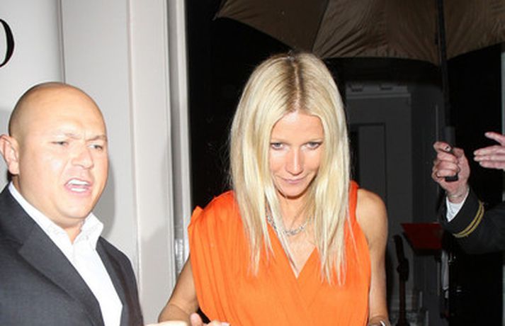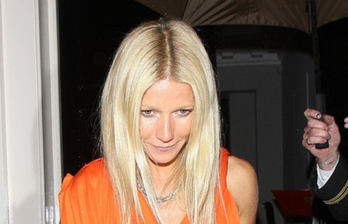 Leikkonan Gwyneth Paltrow, 38 ára, var klædd í appelsínugulan Lanvin kjól þegar hún yfirgaf veitingahús í London í gærkvöldi. Eins og sjá má á myndunum hefur Gwyneth greinilega verið dugleg að lyfta handlóðum. Hún hefur margoft látið hafa eftir sér að hún hatar að vera í megrun. Þá mætir leikkonan sex sinnum í viku í æfingatíma sem ganga út á að lyfta lóðum og hleypur samhliða því til að viðhalda brennslu.
