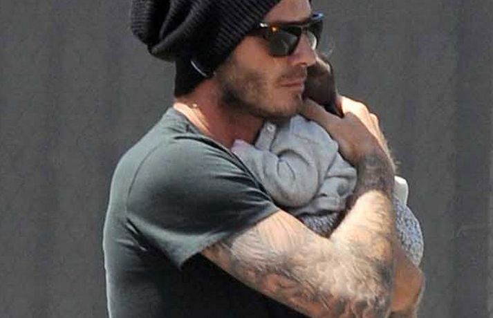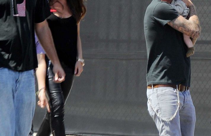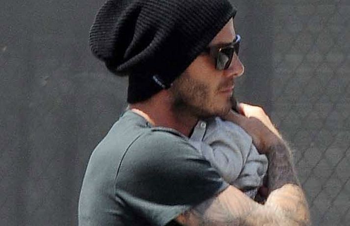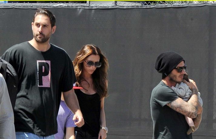 David Beckham, 36 ára, hélt á Harper dóttur sinni, sem fæddist 10. júlí síðastliðinn, í verslunarleiðangri í Hollywood í gærdag. Eins og sjá má á myndunum var Victoria, 37 ára, með í för klædd í leðurbuxur og þetta líka svimandi háa hæla, Louboutin hælaskó réttara sagt. Þá var elsti sonur þeirra, Brooklyn, einnig með í för og lífvörður.