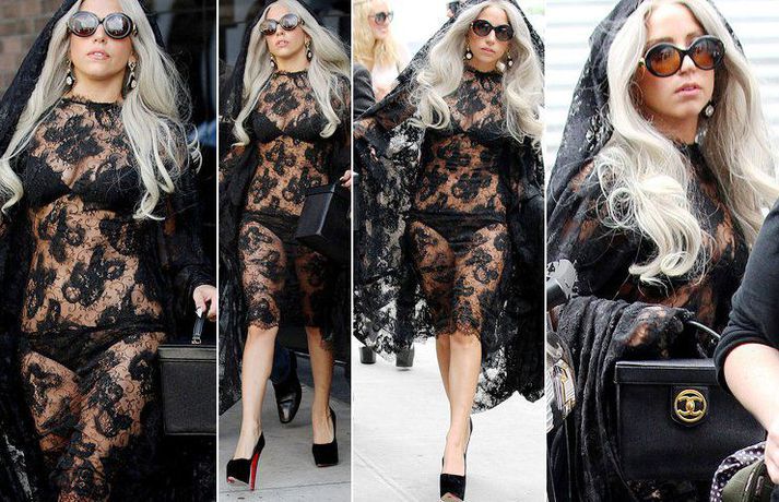 Söngkonan Lady Gaga, 25 ára, var mynduð í New York á laugardaginn var í svörtum gegnsæjum blúndukjól með Coco Chanel leðurtösku og sólgleraugu á nefinu.Traust er eins og spegill. Þú getur ekki, hvernig sem þú reynir, lagað brotin aftur. Þú munt alltaf sjá helvítis brotin í speglinum, lét Lady Gaga hafa eftir sér. Svört nærfötin sem Lady Gaga klæddist undir blúndukjólnum sáust greinilega eins og myndirnar sýna.