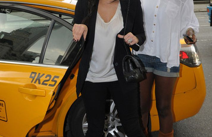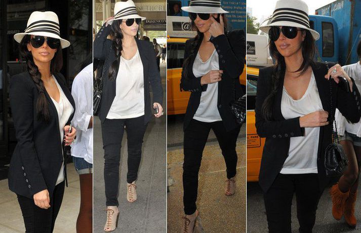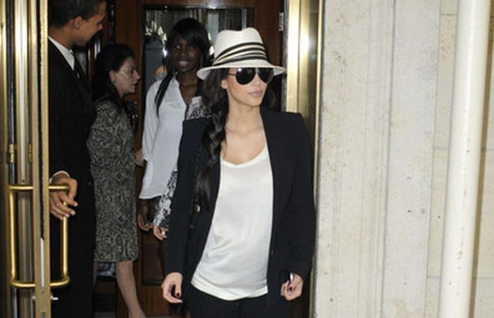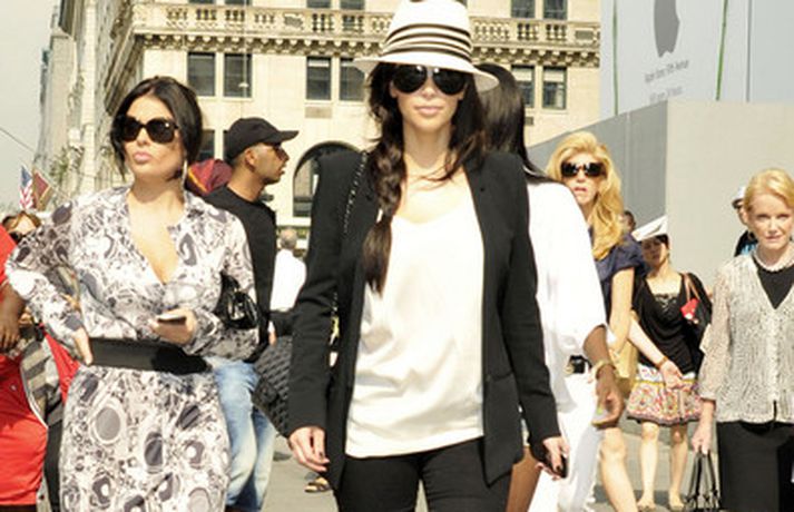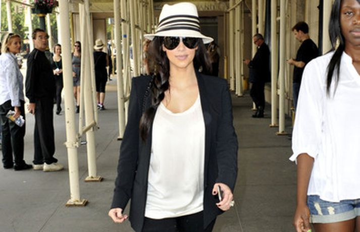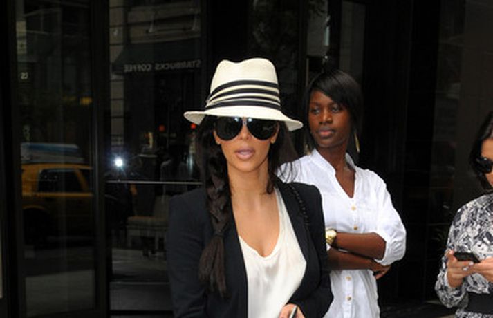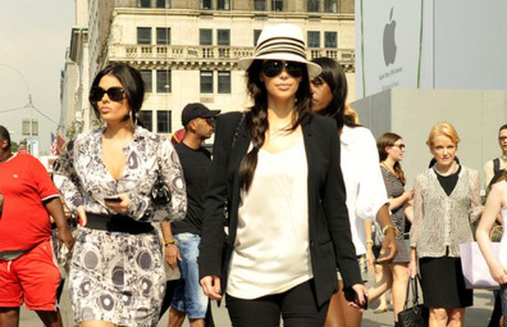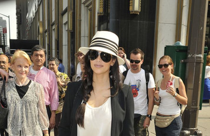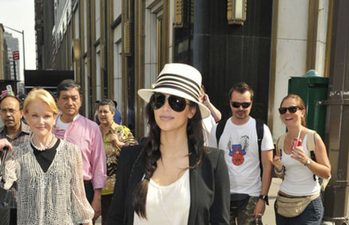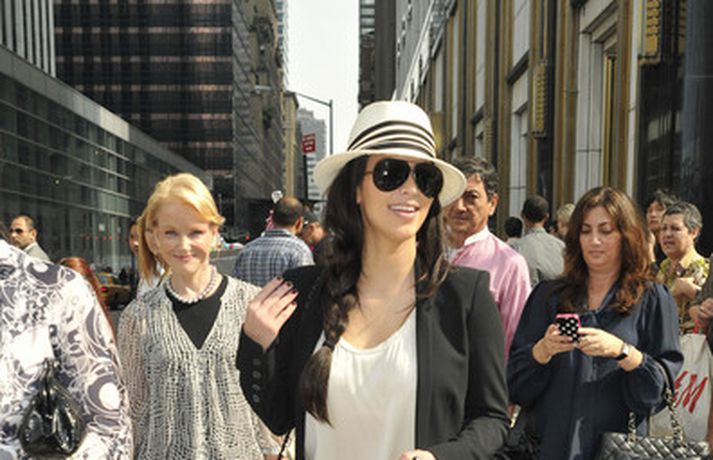 Kim Kardashian, 30 ára, var á ferðinni með vinkonum sínum í New York með risastór sólgleraugu sem huldu stóran hluta af andliti hennar og hatt á höfði. Burtséð frá sólgleraugunum sem fara sjónvarpsstjörnunni þetta líka svona vel, eins og sjá má í myndasafni, segist hún alltaf ganga með tveggja milljón dollara giftingahringinn sinn. Hún er meira að segja með hann þegar hún tekur á því í ræktinni.