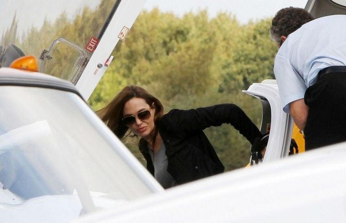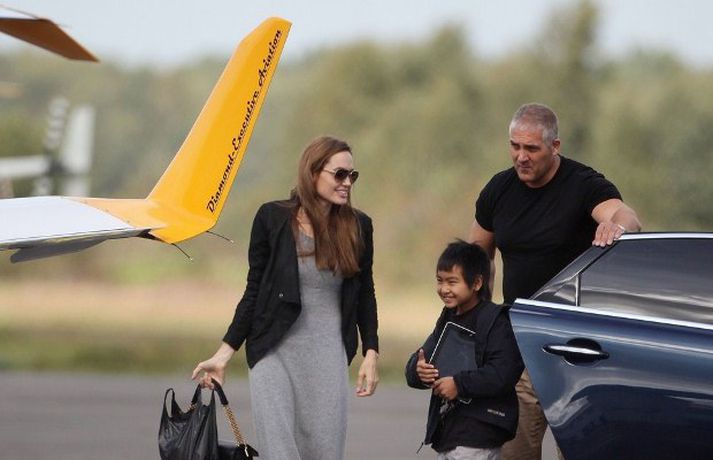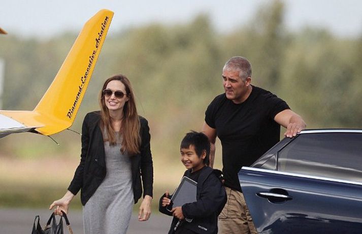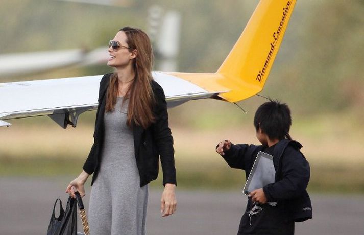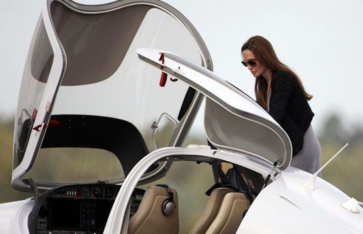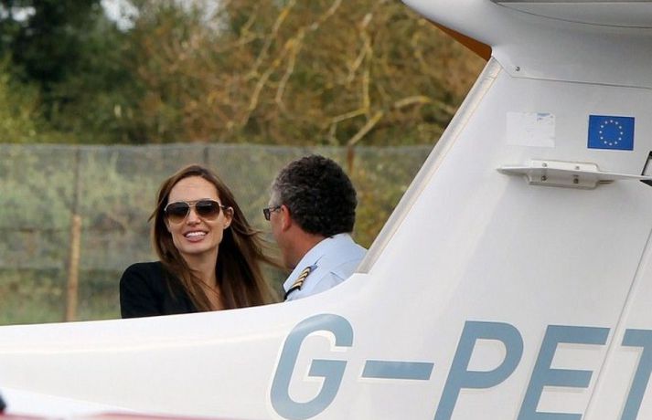 Angelina Jolie, 36 ára, var mynduð á flugvelli í Hampshire í England ásamt tíu ára syni sínum, Maddox, stíga um borð í flugvel með sólgleraugu á nefinu. Drengurinn fékk að sitja í aftursæti vélarinnar á meðan mamma hans lærði að fljúga.Ég er húðflúruð og ég geng í leðri en það eru aðrar hliðar á mér sem eru sjáanlegar í kvikmyndunum mínum, sagði Angelina.