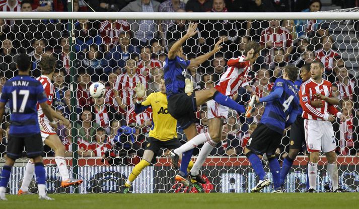 Stoke stöðvaði sigurgöngu Manchester United Kolbeinn Tumi Daðason skrifar 24. september 2011 00:01 Nordic Photos / AFP Manchester United gerði 1-1 jafntefli gegn Stoke í síðdegisleiknum í ensku úrvalsdeildinni. Stigið dugar liðinu til að komast í toppsætið með betri markatölu en grannarnir í City. Liðið var án Wayne Rooney auk þess sem Chicharito meiddist snemma leiks og var skipt af velli. Gestirnir, sem spiluðu án Wayne Rooney sem glímir við meiðsli aftan í læri, urðu fyrir áfalli strax á annarri mínútu leiksins. Þá vildu þeir fá vítaspyrnu og líklega rautt spjald á Jonathan Woodgate fyrir brot á Javier Hernandez sem var sloppinn einn í gegn. Ekkert var dæmt og Hernandez var borinn af velli meiddur. Michael Owen kom inná í hans stað. Englandsmeistararnir náðu forystunni á 27. mínútu. Þá skoraði Nani fallegt mark með vinstri fæti eftir laglegt samspil við Skotann Darren Fletcher. Portúgalinn skoraði glæsilegt mark gegn Chelsea í síðustu umferð og er sjóðandi heitur. Heimamenn jöfnuðu metin á 52. mínútu með marki eftir fast leikatriði. Þá sneri Matthew Etherington boltann inná teiginn úr hornspyrnu þar sem Peter Crouch stangaði knöttinn í netið. Phil Jones, varnarmaður United, gleymdi sér í dekkningunni og De Gea hreyfði sig ekki af marklínunni. Bæði lið fengu færi til þess að tryggja sér sigurinn, Ryan Giggs líklega það besta, en tókst ekki. Jafntefli niðurstaðan og Stoke heldur áfram að hirða stig af stóru liðunum á heimavelli sínum. Liverpool, Chelsea og United hafa öll tapað stigum í Stoke í vetur. Manchester United er með 16 stig í toppsæti deildarinnar líkt og grannarnir í City en með betra markahlutfall. Peter Crouch, sem gekk til liðs við Stoke undir lok félagaskiptagluggans frá Tottenham, varð sjötti leikmaðurinn til þess að skora fyrir sex mismunandi úrvalsdeildarfélög. Staðan í ensku úrvalsdeildinni. Mest lesið Þessi tíu eru tilnefnd sem Íþróttamaður ársins 2025: 23 ára aldursmunur Sport Sagan ekki sönn: „Veit ekki hvaðan þetta á að hafa komið“ Íslenski boltinn Sakaður um niðurlægingu: „Við viljum ekki hafa hann sem þjálfara“ Handbolti Erfitt að vera í burtu þegar mamma greindist Fótbolti Slot mun sakna Isak í tvo mánuði eftir „glórulausa tæklingu“ Enski boltinn Einn leikmaður með samning og völlurinn ólöglegur Fótbolti Áfallið staðreynd og Isak búinn í aðgerð Enski boltinn Kansas frá Kansas til Kansas Sport Vildi tapa legg: „Mesti hávaði sem ég hef heyrt“ Sport Missti alveg stjórn á skapinu en það skilaði sigri Körfubolti Fleiri fréttir Chelsea setur sig í samband við Semenyo Jiménez jafnaði bestu vítaskyttu sögunnar Slot mun sakna Isak í tvo mánuði eftir „glórulausa tæklingu“ Sjáðu „auma“ vítið sem skilaði Fulham sigri Fulham skildi Forest eftir við fallsvæðið Áfallið staðreynd og Isak búinn í aðgerð Fagnaði titli Liverpool sem óður maður um alla borg „Allir virðast elska hann“ „Þetta mun ekki buga okkur“ Guardiola mun vigta leikmenn Man City eftir jólin „Ef þið væruð Antoine Semenyo, hvert mynduð þið fara?“ Sjáðu mörkin: Rogers sá um Manchester United Óttast að Isak hafi fótbrotnað Tvenna frá Rogers tryggði Villa sigur gegn Manchester United Fimmta sinn sem Arsenal er á toppnum um jólin: Unnu ekki titilinn í fyrstu fjögur skiptin „Viljum við að okkar verði minnst fyrir að vera skræfur?“ „Ef dómarinn hefði sinnt sínu starfi almennilega hefði Romero ekki fengið spjald“ Haaland gaf barnabarni Hareide gjöf Sjáðu mörkin úr enska: Sviptingar, sænskt þema og svakalegar tæklingar Calvert-Lewin hættir ekki að skora Gyökeres skaut Arsenal aftur á toppinn Slot fámáll um stöðuna á Isak Gleði og sorg í sigri Liverpool Dramatík er Broja reyndist hetja Burnley Haaland frábær er Manchester City komst á toppinn Andri Lucas skoraði í langþráðum sigri Blackburn Chelsea vann upp tveggja marka forskot á St James' Park Ekkert fararsnið á Guardiola sem segir að City verði að vera undirbúið Tíu bestu mörkin úr leikjum Liverpool og Tottenham Salah bað samherjana afsökunar Sjá meira