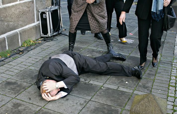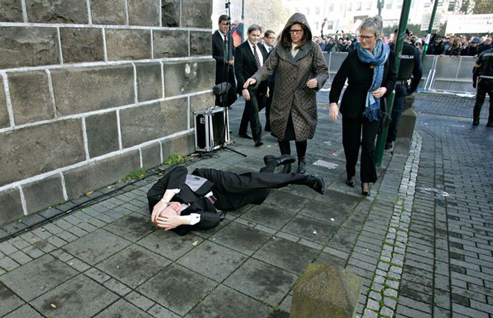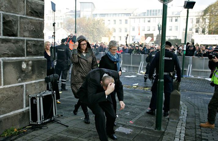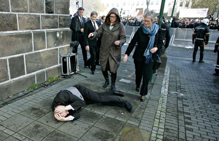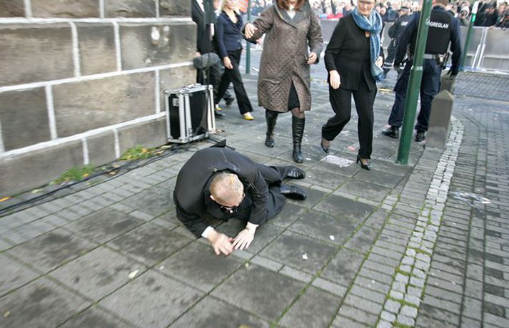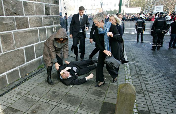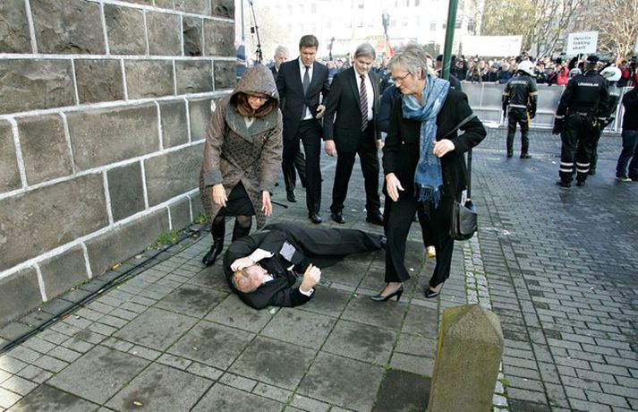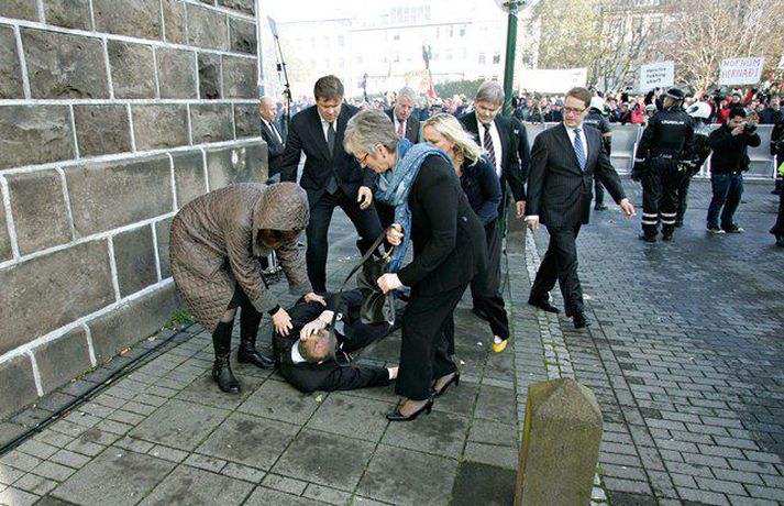 Það er óhætt að segja að þeim þingmönnum sem næst stóðu Árna Þór Sigurðssyni hafi verið brugðið þegar hann féll í götuna eftir að hafa fengið egg í gagnaugað. Þeir voru þó fljótir að átta sig og komu honum til bjargar. Árni Þór sagði í samtali við Vísi fyrr í dag að hann hefði skilning á því að fólk mótmælti en það væri synd ef mótmælin fælu í sér skemmdir eða ofbeldi. Myndirnar sem, Daníel Rúnarsson ljósmyndari tók og eru birtar hér að neðan segja meira en mörg orð.